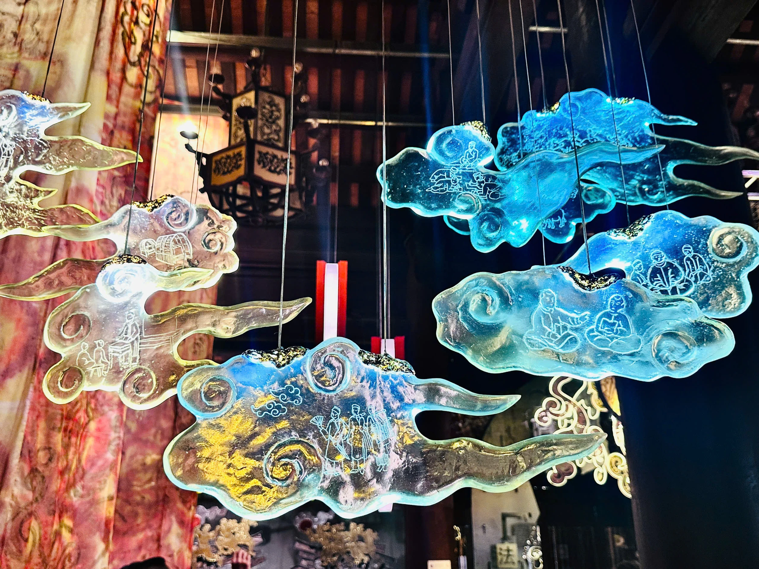 Bước vào không gian của họa sỹ Vũ Xuân Đông, người xem như lạc vào một cõi mơ của tri thức qua tác phẩm “Mây bay, Hoa nở”. Sự kết hợp giữa nét thô ráp của khung sắt, sự mong manh của giấy dó và sự hư ảo của ánh sáng LED, đã tạo nên một cấu trúc thị giác đầy ám ảnh. Những hoa văn mây, hoa cúc thời Lý không còn nằm trên đá lạnh, mà như đang bay lên, nở rộ giữa không trung. Vũ Xuân Đông đã gửi gắm vào đây triết lý về sự khổ luyện. Đạo học, với anh, là một hành trình “hóa thân”: từ sự thô mộc của bản năng đến sự thanh cao của trí tuệ. Mỗi khối sáng là một tầng tâm thức, khẳng định rằng: khi con người đạt đến độ chín của tri thức, họ sẽ tự tại như mây và rạng rỡ như hoa.