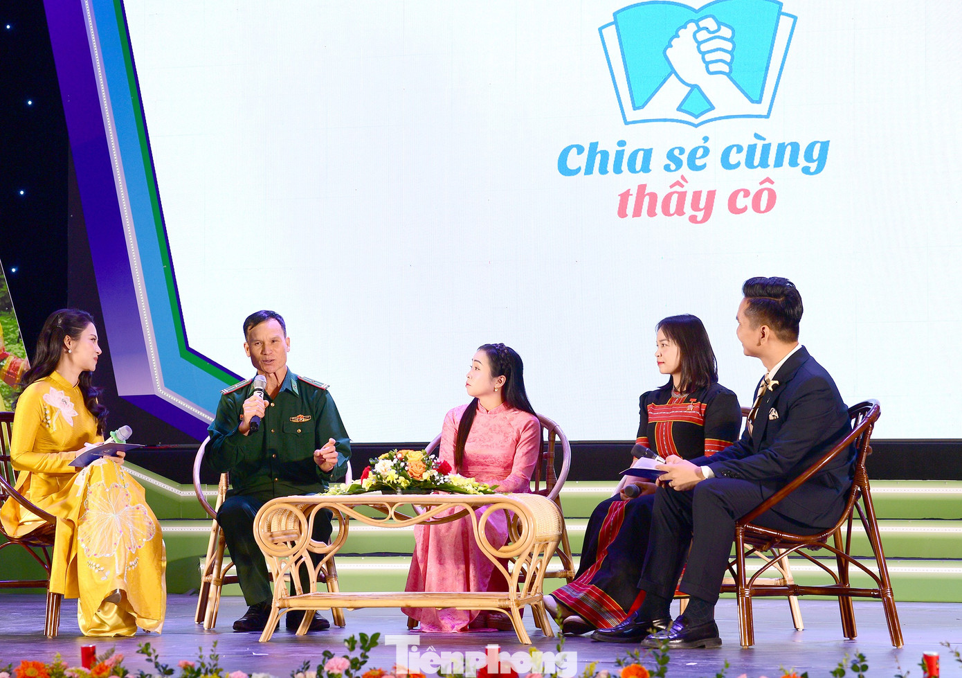 Tại chương trình tuyên dương “Chia sẻ cùng thầy cô” năm 2025 đã có những khoảng lặng xúc động và hạnh phúc với câu chuyện của cô Đinh Thị Lệ Thu - giáo viên Trường Tiểu học Đường Hoa, xã Đường Hoa (tỉnh Quảng Ninh); “thầy giáo quân hàm xanh" Lò Văn Phích - cán bộ vận động quần chúng, Đồn Biên phòng Nậm Lạnh (tỉnh Sơn La); và cô Y Hải - Trường Tiểu học và Trung học cơ sở Đắk Dục (tỉnh Quảng Ngãi).