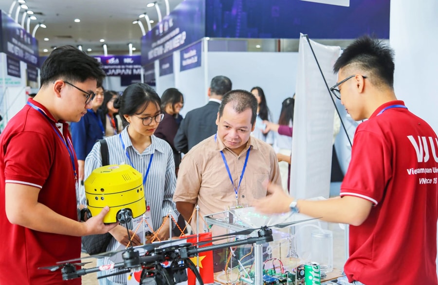 Giới thiệu sản phẩm máy bay không người lái của Trường Đại học Việt Nhật (Đại học Quốc gia Hà Nội) tại Triển lãm quốc tế Đổi mới sáng tạo Việt Nam 2025.