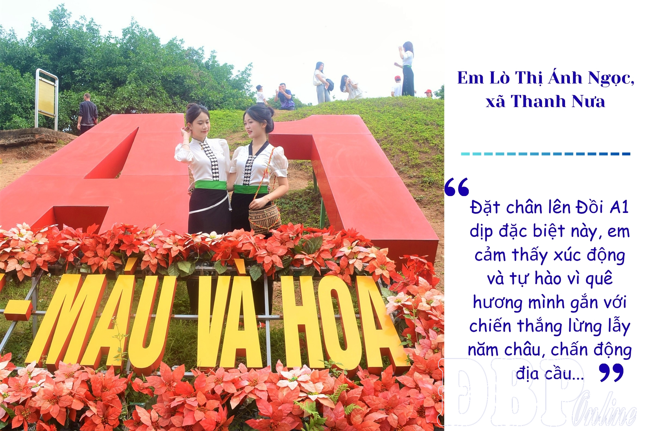 Em Lò Thị Ánh Ngọc, xã Thanh Nưa, sinh viên đang học tập tại tỉnh ngoài, tranh thủ kỳ nghỉ trở về quê hương và cùng bạn bè đến Đồi A1 tham quan. Trong trang phục áo cóm truyền thống của dân tộc Thái, Ngọc lưu lại nhiều bức ảnh bên di tích. Em chia sẻ: “Đặt chân lên Đồi A1 dịp đặc biệt này, em cảm thấy xúc động và tự hào vì quê hương mình gắn với chiến thắng lừng lẫy năm châu, chấn động địa cầu. Vừa mang giá trị lịch sử sâu sắc, di tích còn rất đẹp, không gian thoáng đãng, nhiều góc cảnh ấn tượng để lưu lại những bức ảnh ý nghĩa. Với em, đây cũng là cách để giới thiệu hình ảnh Điện Biên đến bạn bè ở nơi xa”.