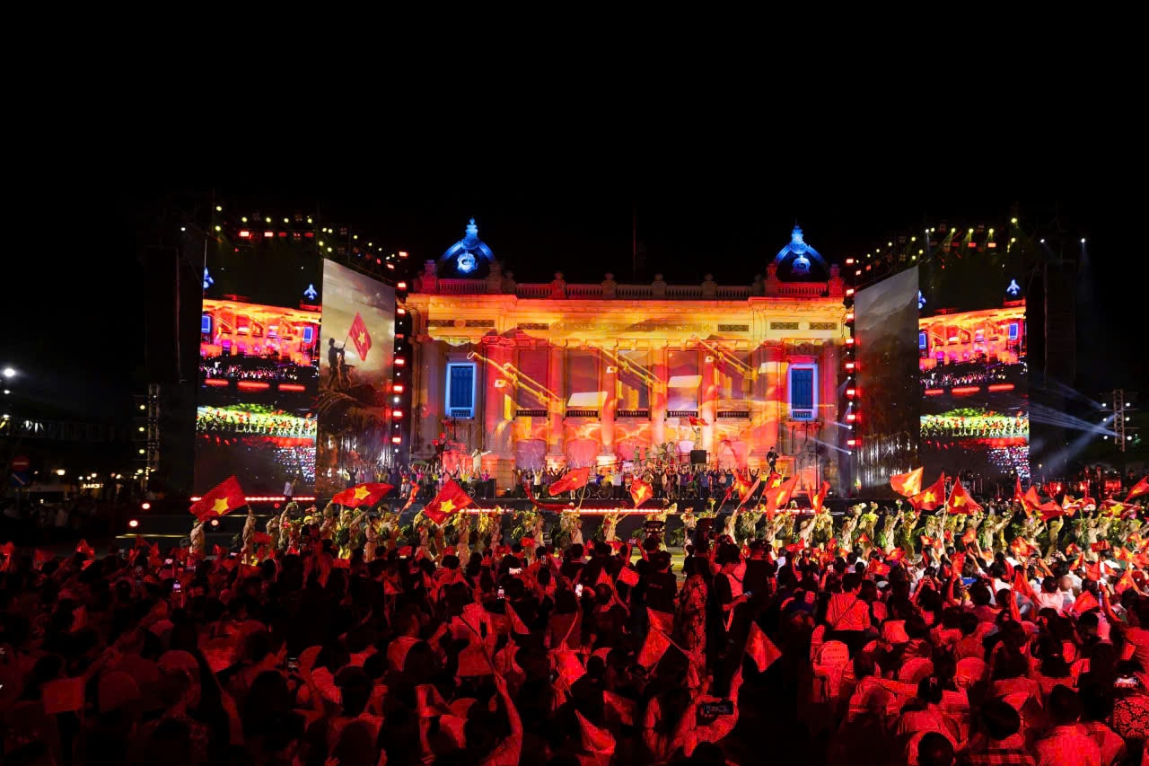 Chương trình biểu diễn chào mừng 80 năm Cách mạng Tháng Tám và Quốc khánh 2-9 tại Nhà hát Lớn Hà Nội do Nhà hát Ca múa nhạc Thăng Long, Hà Nội tổ chức. Ảnh: NH