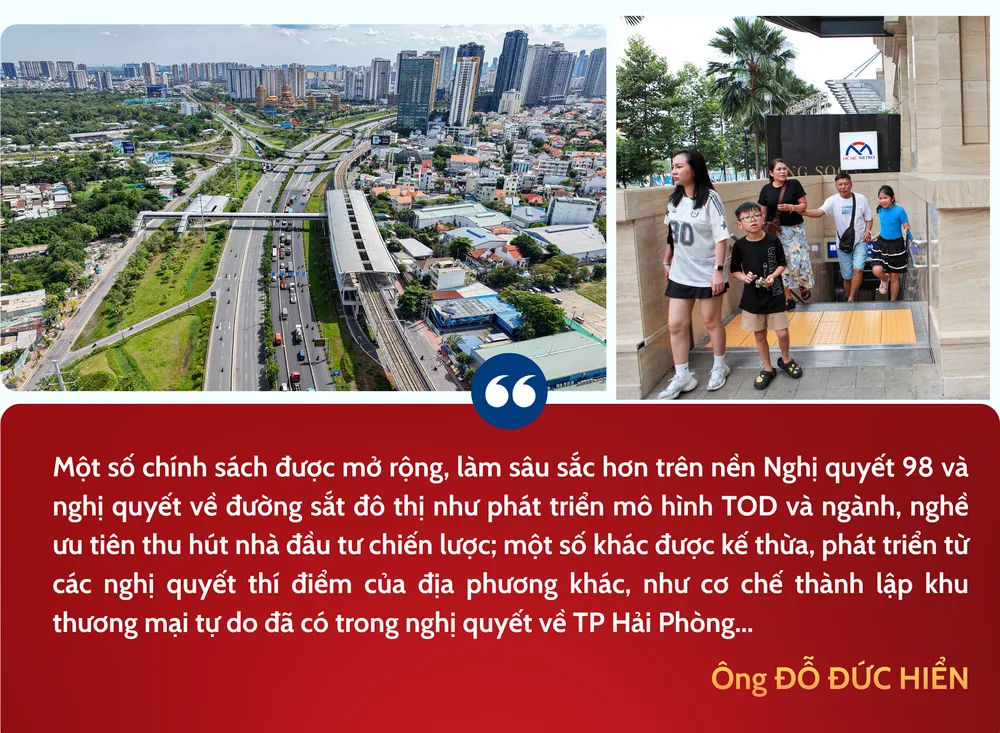 Một số chính sách được mở rộng, làm sâu sắc hơn trên nền Nghị quyết 98 và nghị quyết về đường sắt đô thị như phát triển mô hình TOD và ngành, nghề ưu tiên thu hút nhà đầu tư chiến lược; một số khác được kế thừa, phát triển từ các nghị quyết thí điểm của địa phương khác, như cơ chế thành lập khu thương mại tự do đã có trong nghị quyết về TP Hải Phòng.
