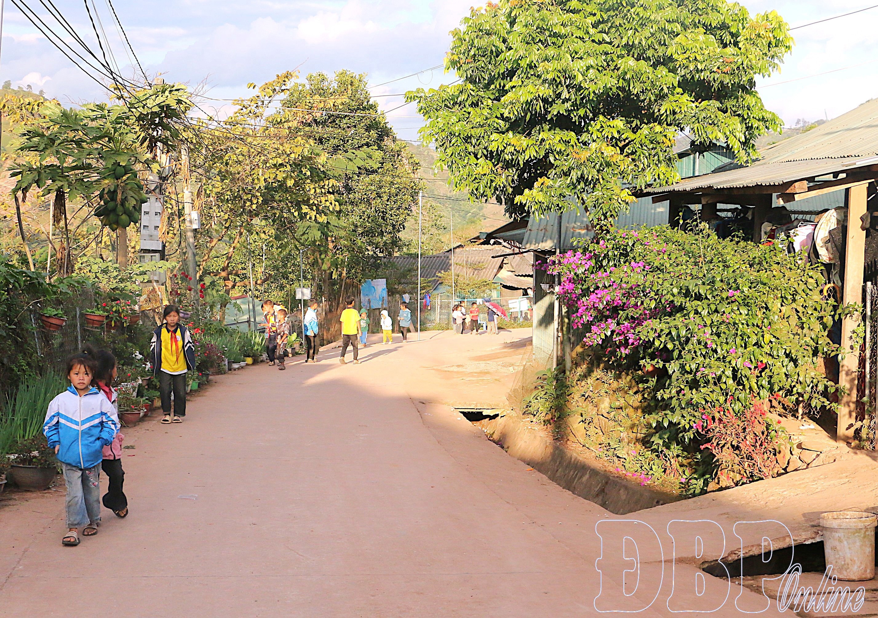 Nhiều tuyến đường nội bản xã Nà Bủng được bê tông hóa giúp người dân, học sinh đi lại thuận tiện. Trong ảnh: Tuyến đường nội bản, bản Huổi Khương, xã Nà Bủng.