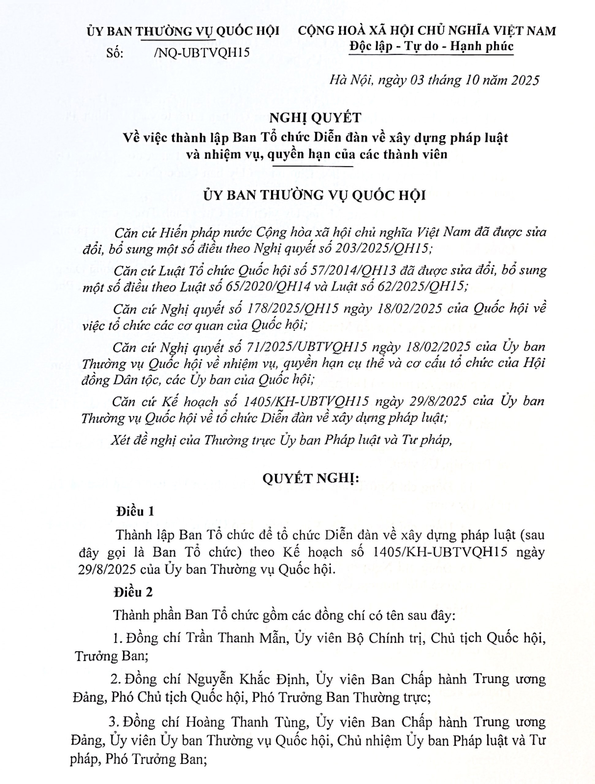 Nguồn Đại Biểu Nhân Dân : https://daibieunhandan.vn/nghi-quyet-ve-viec-thanh-lap-ban-to-chuc-dien-dan-ve-xay-dung-phap-luat-va-nhiem-vu-quyen-han-cua-cac-thanh-vien-10390244.html