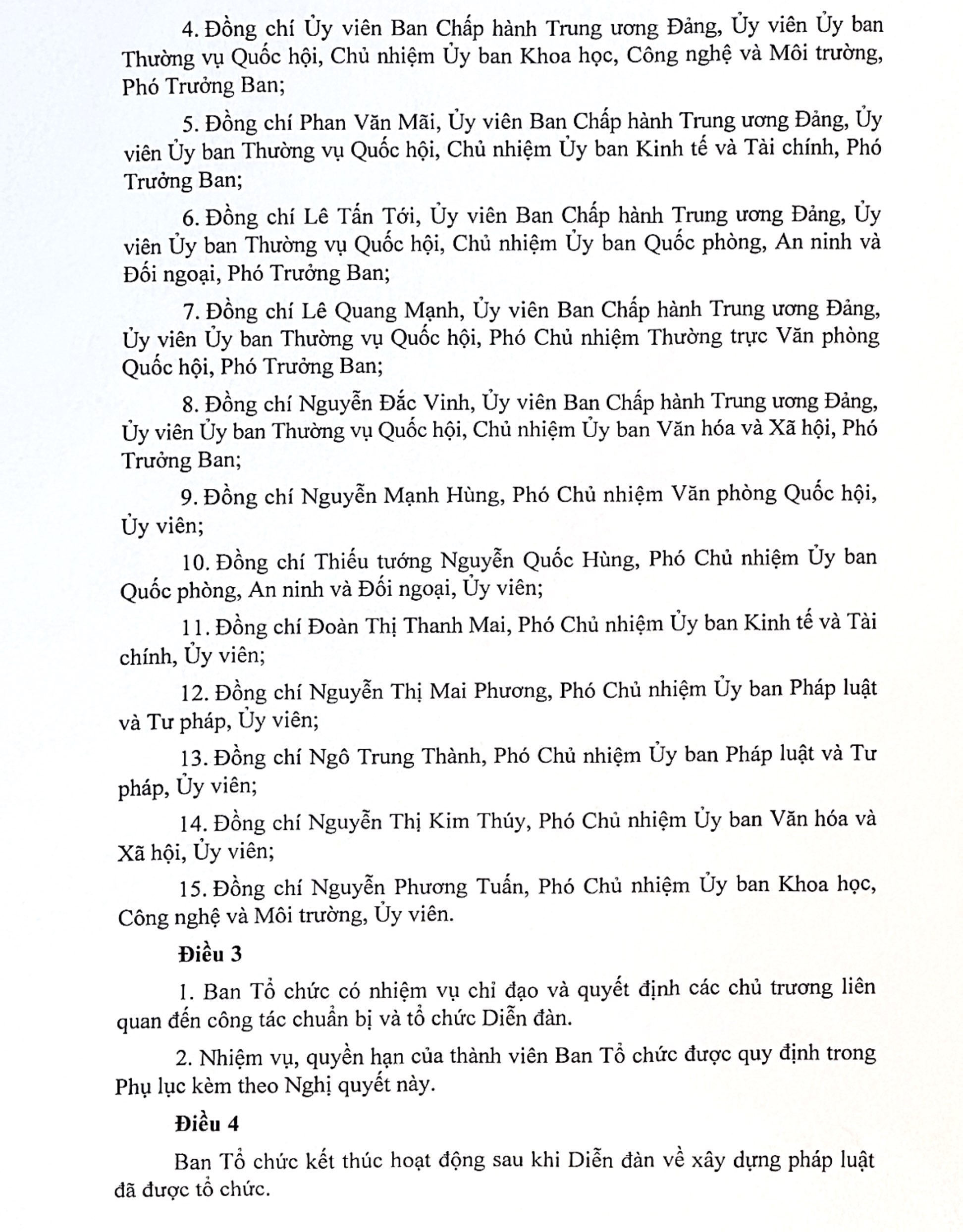 Nghị quyết Về việc thành lập Ban tổ chức Diễn đàn về xây dựng pháp luật và nhiệm vụ, quyền hạn của các thành viên