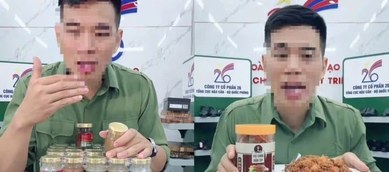 Lê Anh Nuôi livestream bán sản phẩm yến chưng, khô heo cháy tỏi đằng sau là logo của Công ty cổ phần 26 (thuộc Bộ Quốc phòng).