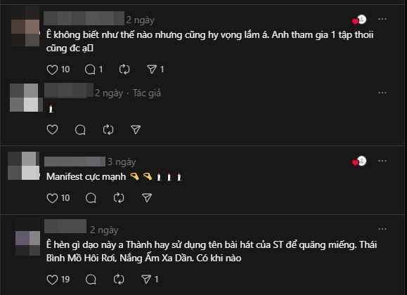 Trên mạng xã hội Threads, cư dân mạng những ngày qua liên tục bàn tán về khả năng Sơn Tùng M-TP tham gia Running Man Việt Nam mùa 3. Nhiều người còn cung cấp hàng loạt dữ liệu đến từ bộ 7 cast chính của chương trình có liên quan đến Sơn Tùng M-TP. Chẳng hạn như Trấn Thành từng đăng bài viết với dòng trạng thái "Nơi này có anh" và "Nắng ấm xa dần", tên hai ca khúc nổi tiếng của Sơn Tùng M-TP.