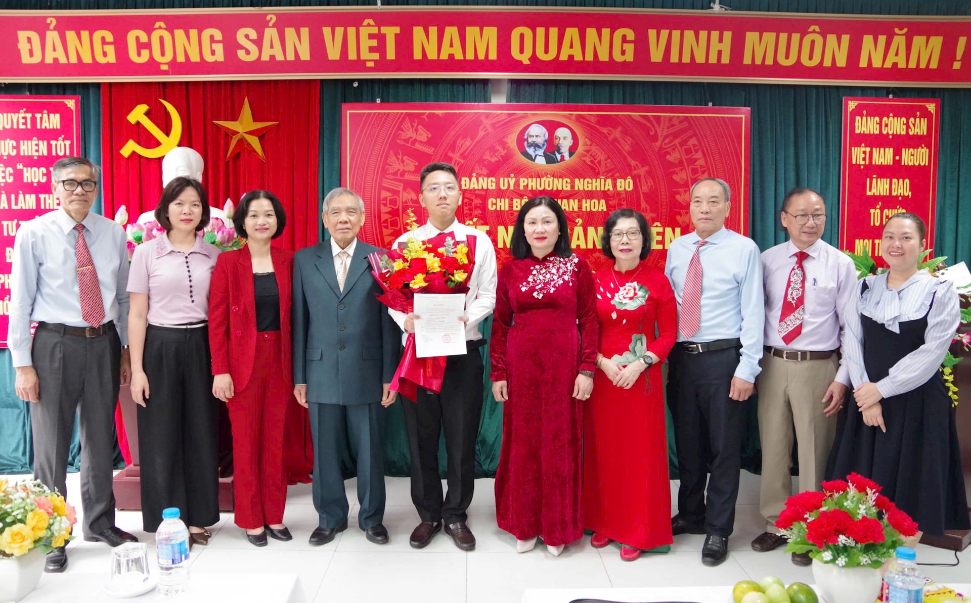Lãnh đạo phường Nghĩa Đô và Chi bộ số 1 tặng hoa chúc mừng mừng tân đảng viên Trần Quang Thắng. Ảnh: Vân Nhi.