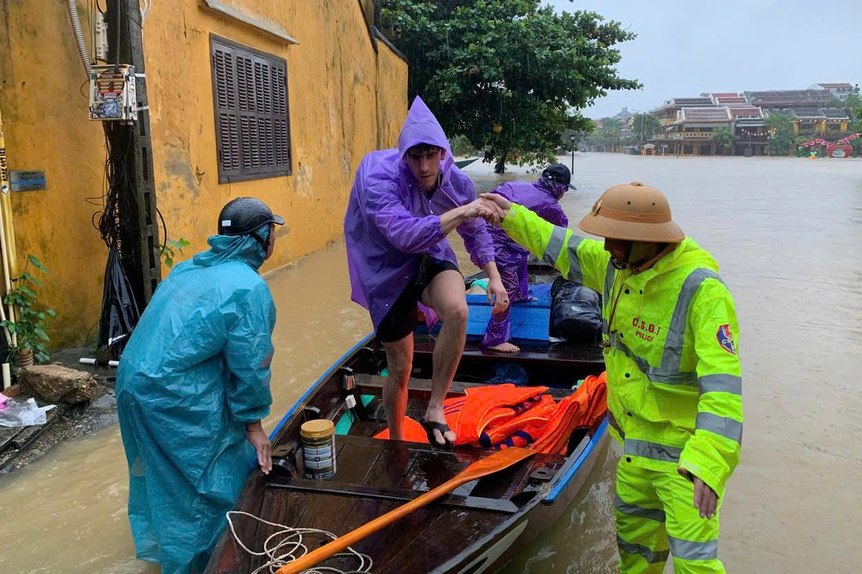 Cảnh sát giao thông Đà Nẵng đưa một du khách nước ngoài ra khỏi vùng ngập tại phường Hội An (TP Đà Nẵng)