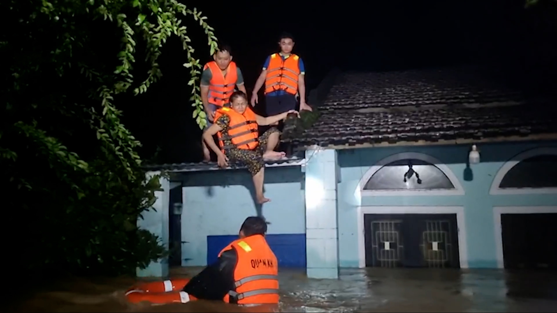 Lực lượng Bộ Chỉ huy Quân sự tỉnh Hà Tĩnh dùng ca nô vượt dòng nước lũ để sơ tán hàng trăm người dân các thôn Trường Yên, Trường Phú và Cảnh Trường (phường Vũng Áng, tỉnh Hà Tĩnh) đến nơi an toàn trong sáng 31-10