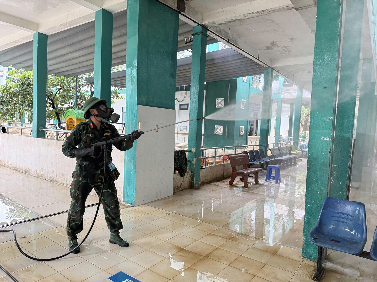 Chiến sĩ Quân khu 5 tiêu độc, khử trùng ở Bệnh viện Đa khoa Khu vực Quảng Nam (phường Điện Bàn, TP Đà Nẵng) sau khi bị lũ cô lập 5 ngày liền