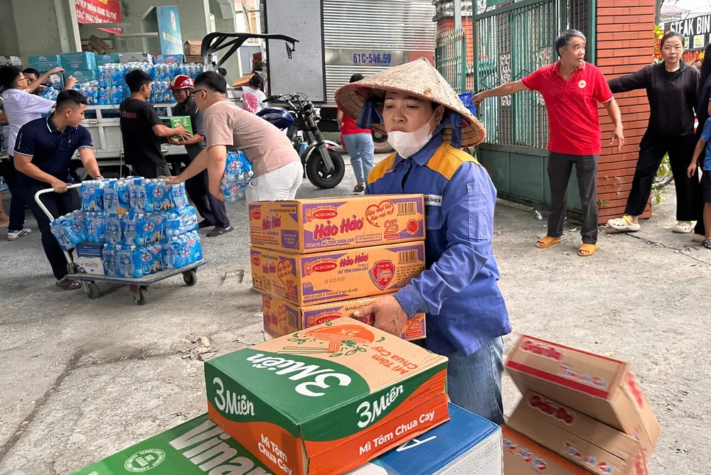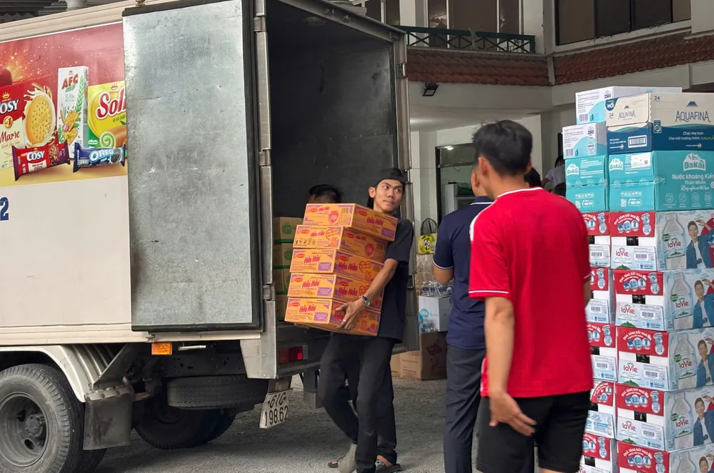 Ngay từ sáng, người dân đã liên tục mang theo đủ loại nhu yếu phẩm như mì tôm, sữa, nước uống, quần áo, chăn màn, thuốc men, bánh kẹo… Tất cả được vận chuyển bằng đủ phương tiện, từ xe máy, ô tô cá nhân đến cả xe tải của các doanh nghiệp.