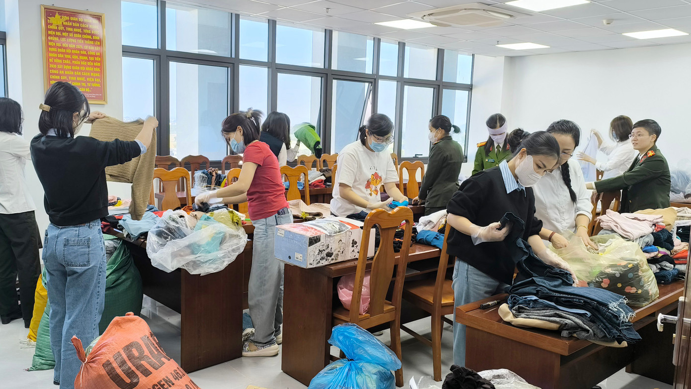 Ban Phụ nữ Công an tỉnh Bắc Ninh phân loại quần áo để ủng hộ bà con vùng lũ ở tỉnh Phú Yên (cũ).