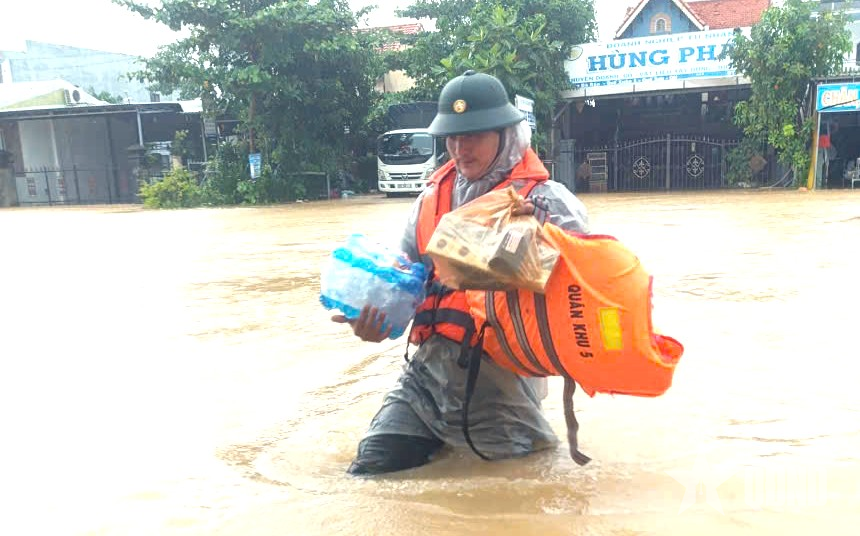 Trên đỉnh lũ Hội An, Cửa Đại, Điện Bàn, Hòa Xuân, Hòa Tiến (Đà Nẵng); Sơn Tây Thượng, Ba Vinh, Tây Trà Bồng, Sơn Linh, Đắk Plô (Quảng Ngãi); thực hiện chỉ đạo của Trung tướng Lê Ngọc Hải, Tư lệnh Quân khu 5, ba ngày qua, mặc trời mưa to, nước lũ dâng cao, bộ đội, dân quân đã vận chuyển được hàng chục tấn lương khô, mì gói, bánh mì, thuốc men đến tận nơi cấp phát tới bà con.