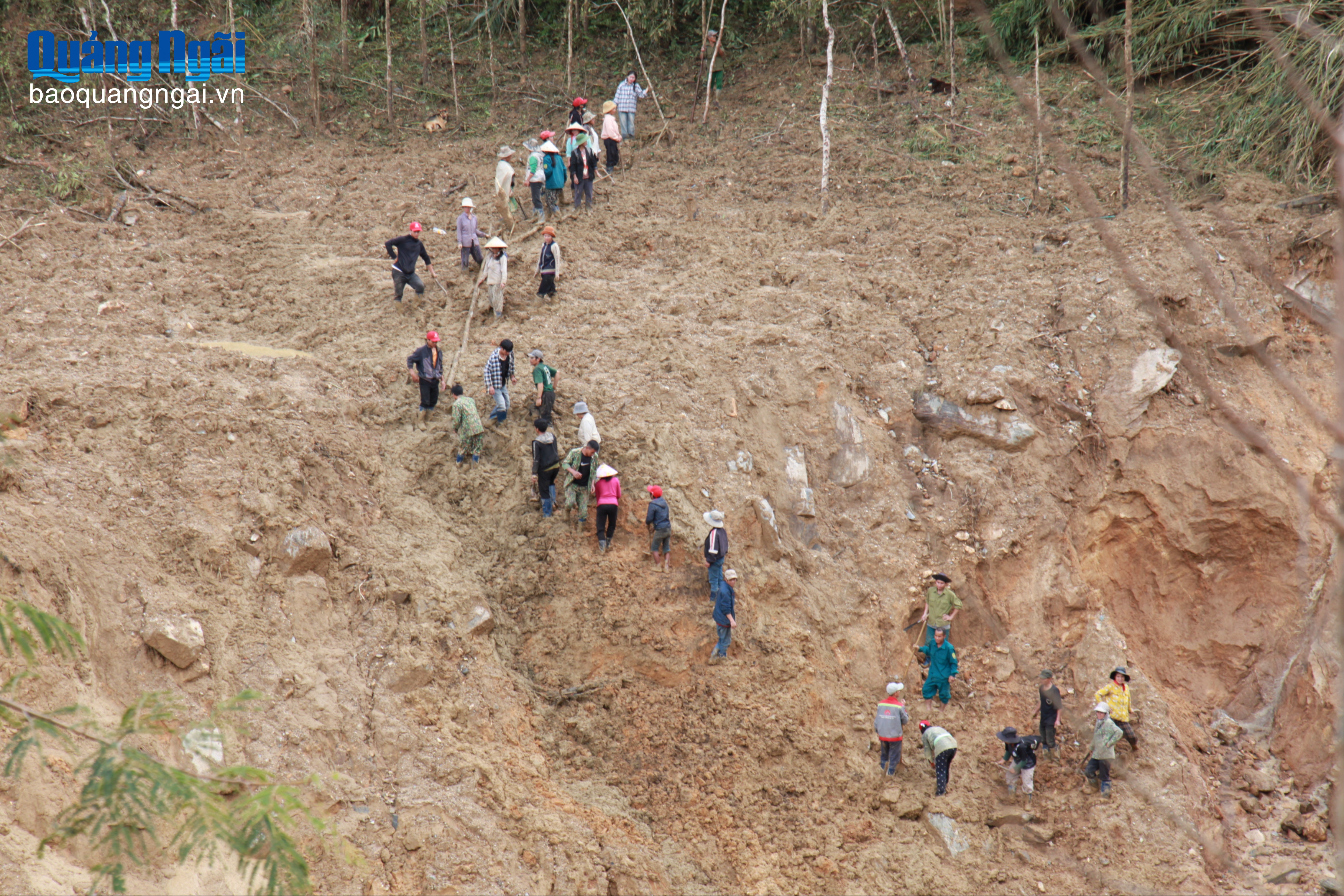 Tại hiện trường, hàng trăm người gồm bộ đội, công an, dân quân, đoàn viên thanh niên và người dân đang mở lối qua triền đồi để đưa nhu yếu phẩm vào vùng bị chia cắt. Mưa vẫn rơi làm đất nhão nhoẹt, từng nhát cuốc, bước chân lún sâu trong bùn.