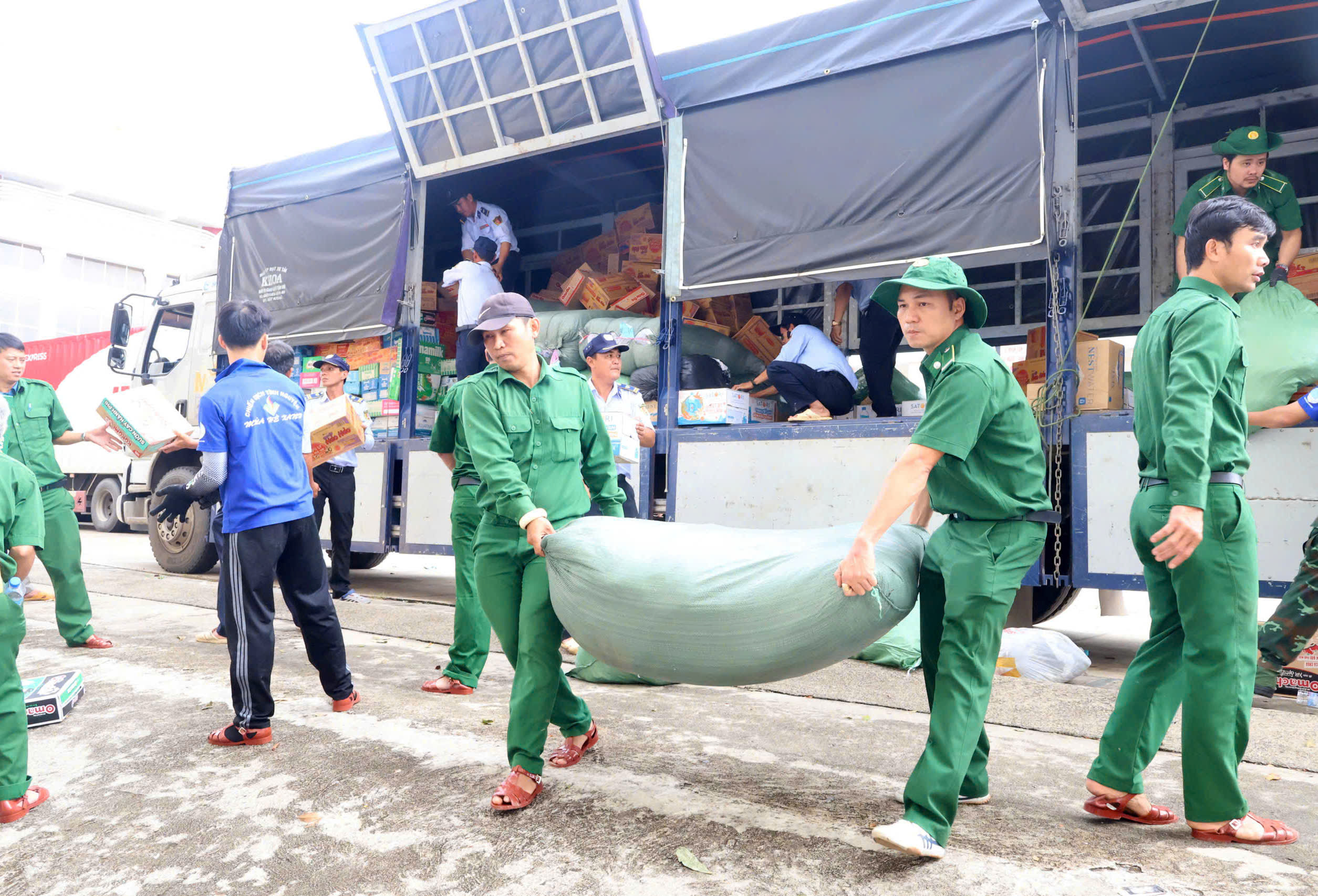 Trước mặt họ là những chiếc xe container lớn chở đầy hàng hóa, gồm gạo, mì gói, nước uống, hộp sữa, dầu ăn, nhu yếu phẩm các loại... Mỗi túi hàng được đóng gói kỹ lưỡng trong túi ni lông trong suốt, nặng trịch. Các chiến sĩ TNXP vác từng túi trên vai, chuyền từ tay người đứng trên cao xuống tay người đứng dưới đất, rồi lại tiếp tục chuyển sâu vào bên trong để xếp thành từng dãy gọn ghẽ, sẵn sàng cho những chuyến xe tỏa đi các địa phương đang bị ảnh hưởng nặng nề.