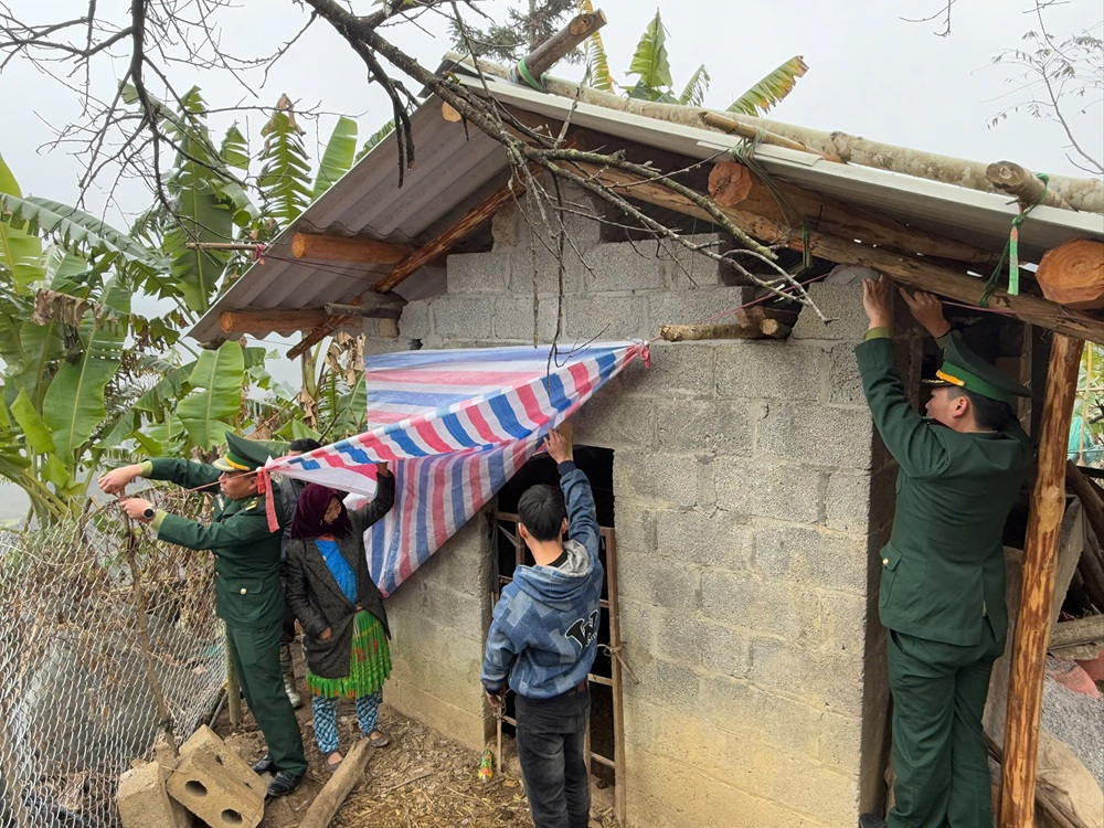 Cán bộ, chiến sĩ Đồn Biên phòng Sơn Vĩ giúp dân che chắn chuồng trại cho vật nuôi.