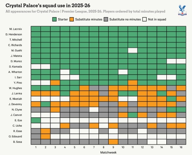 Biểu đồ sử dụng nhân sự của Palace (Chú thích: màu xanh là ra sân ngay từ đầu, màu cam là xuất phát từ băng ghế dự bị, màu xám là dự bị nhưng không được ra sân, màu trắng là không có tên trong đội hình xuất phát).