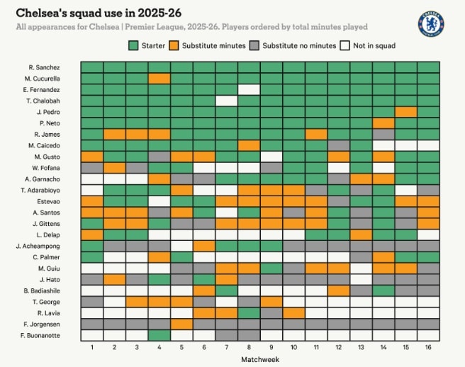 Biểu đồ sử dụng nhân sự của Chelsea (Chú thích: màu xanh là ra sân ngay từ đầu, màu cam là xuất phát từ băng ghế dự bị, màu xám là dự bị nhưng không được ra sân, màu trắng là không có tên trong đội hình xuất phát).