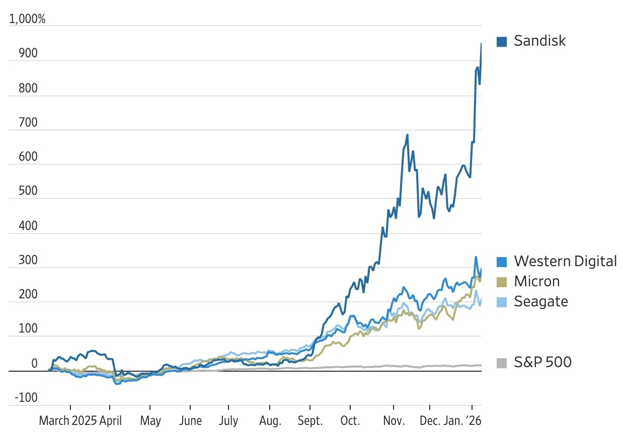 Cổ phiếu một số công ty sản xuất bộ nhớ từ khi Sandisk tách khỏi WD tháng 2/2025. Ảnh: WSJ.