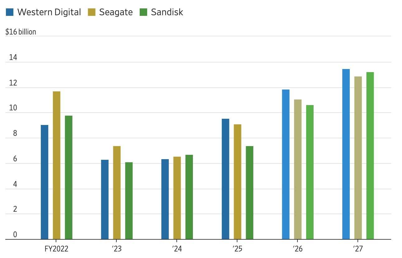 Theo WSJ, cổ phiếu các công ty bộ nhớ đang được "săn đón" tại Phố Wall. Micron, Seagate và Western Digital (WD) đều chứng kiến cổ phiếu tăng hơn gấp đôi trong năm 2025. Hãng bộ nhớ Sandisk sau khi tách khỏi WD thậm chí ghi nhận cổ phiếu tăng gấp 10 lần. Tại Hàn Quốc, cổ phiếu SK Hynix tăng 88% chỉ trong 3 tháng.