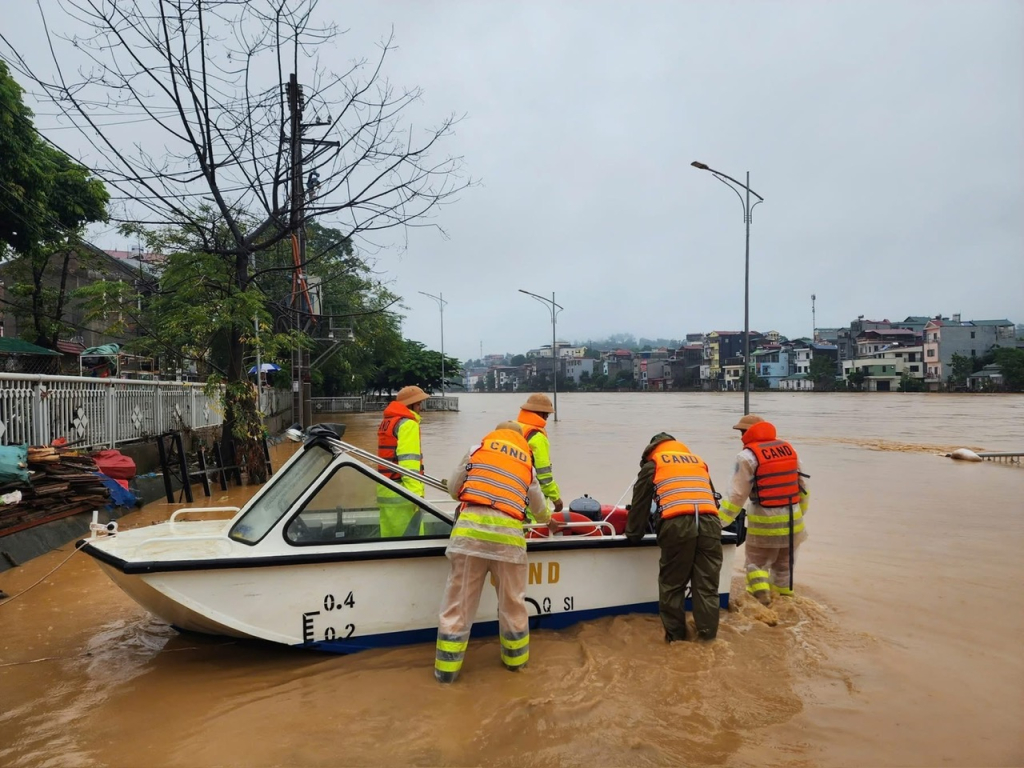 Lực lượng chức năng chuẩn bị ca nô sẵn sàng cứu hộ người dân.