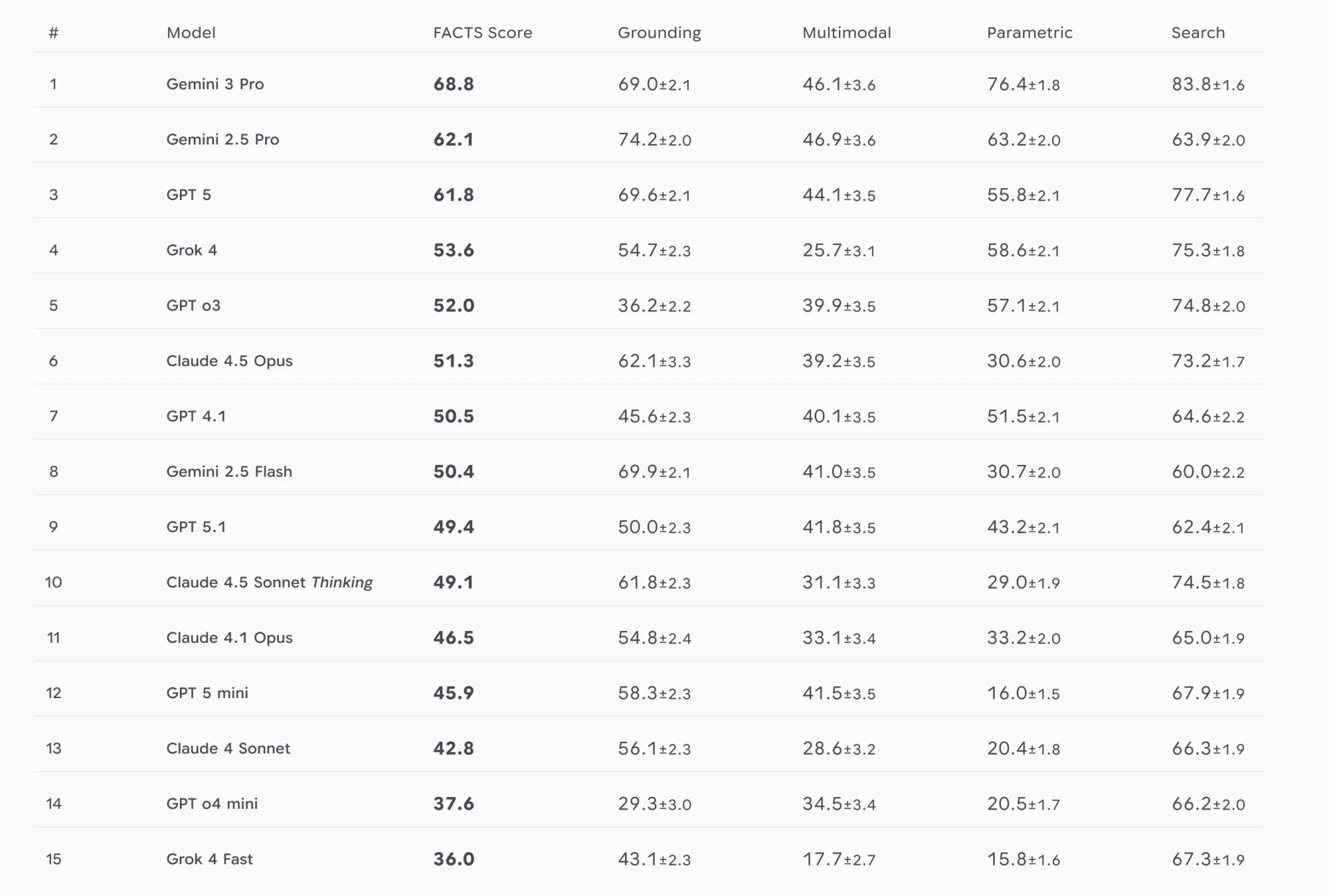 Theo FACTS Benchmark Suite, mô hình AI đạt kết quả tốt nhất là Google Gemini 3 Pro, với độ chính xác 68,8%. Trong khi các mô hình AI hàng đầu khác như GPT-5 (61,8%), GPT-5.1 (49,4%), Grok 4 (53,6%) và Claude 4.5 Opus (51,3%) đạt kết quả thấp hơn.