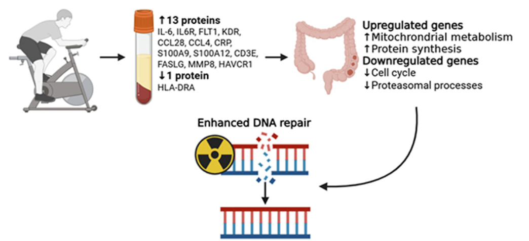 Huyết thanh từ mẫu máu lấy sau khi tập thể dục đã được thử nghiệm trên tế bào ung thư đại tràng. Các nhà nghiên cứu đã phát hiện ra những thay đổi trong biểu hiện gen và dấu hiệu của sự tăng cường sửa chữa ADN. Nguồn: Tạp chí Ung thư Quốc tế