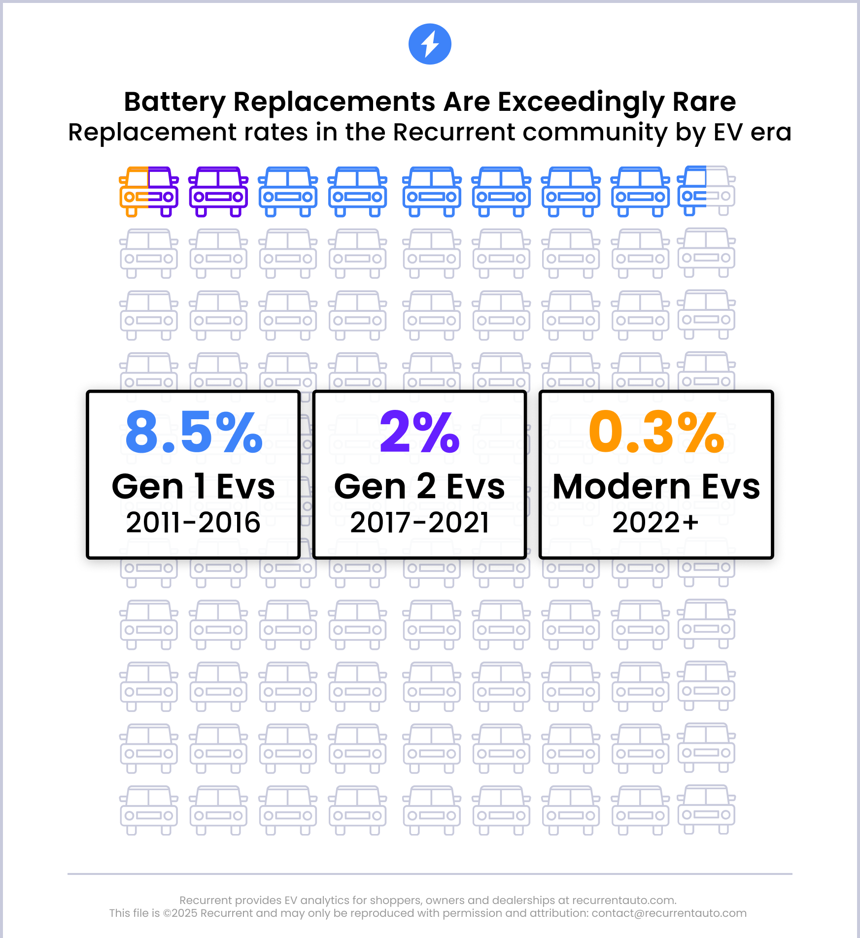 Dựa trên việc theo dõi và phân tích dữ liệu thời gian thực của hơn 20.000 xe điện đang lưu thông, Recurrent đưa ra một con số đáng ngạc nhiên: Trong số tất cả các xe điện được bán ra tại Mỹ từ năm 2011 đến nay, chỉ có 2,5% số xe phải thay pin.