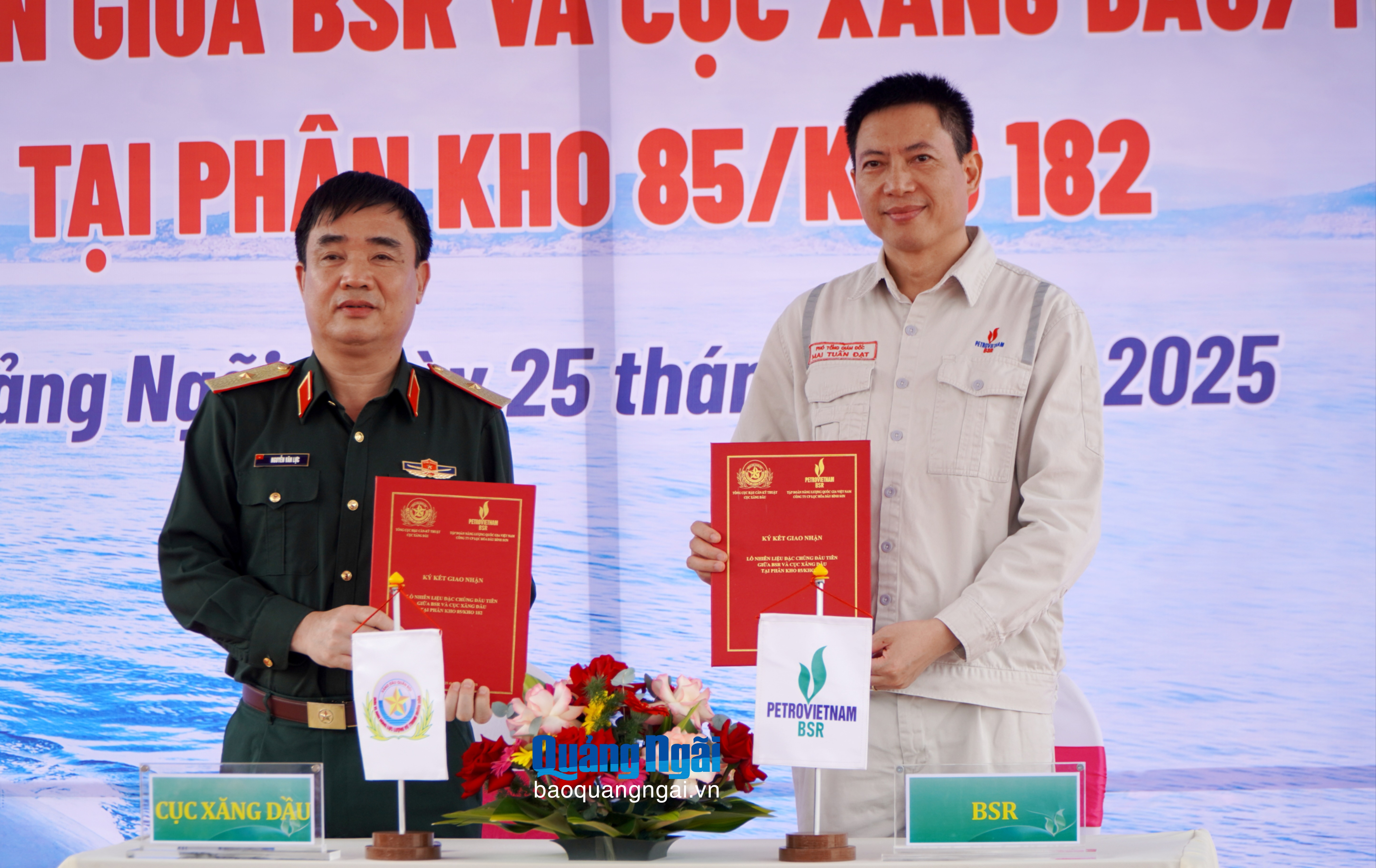 Thiếu tướng Nguyễn Văn Lực, Cục trưởng Cục Xăng dầu và Phó Tổng Giám đốc Công ty CP Lọc hóa dầu Bình Sơn Mai Tuấn Đạt giao - nhận sản phẩm lô nhiên liệu đặc chủng đầu tiên.