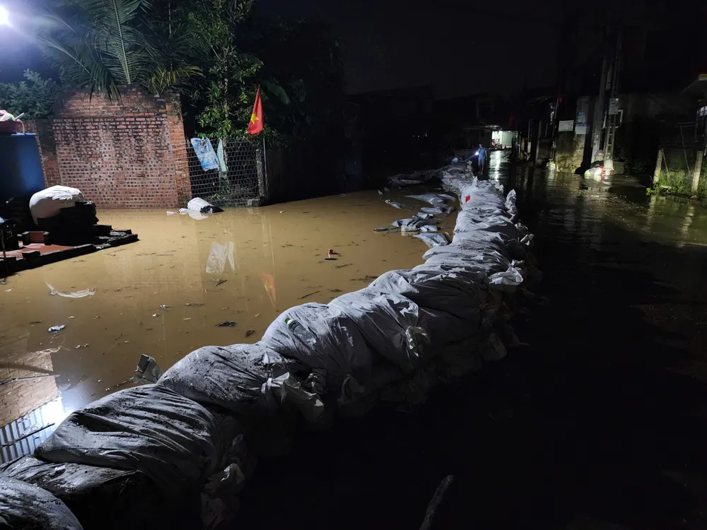 Mực nước sông Cầu tại Chã dâng cao trong đêm 8-10, người dân Thái Nguyên cùng lực lượng chức năng thức đêm đắp bờ tạm ngăn lũ. Ảnh: AH