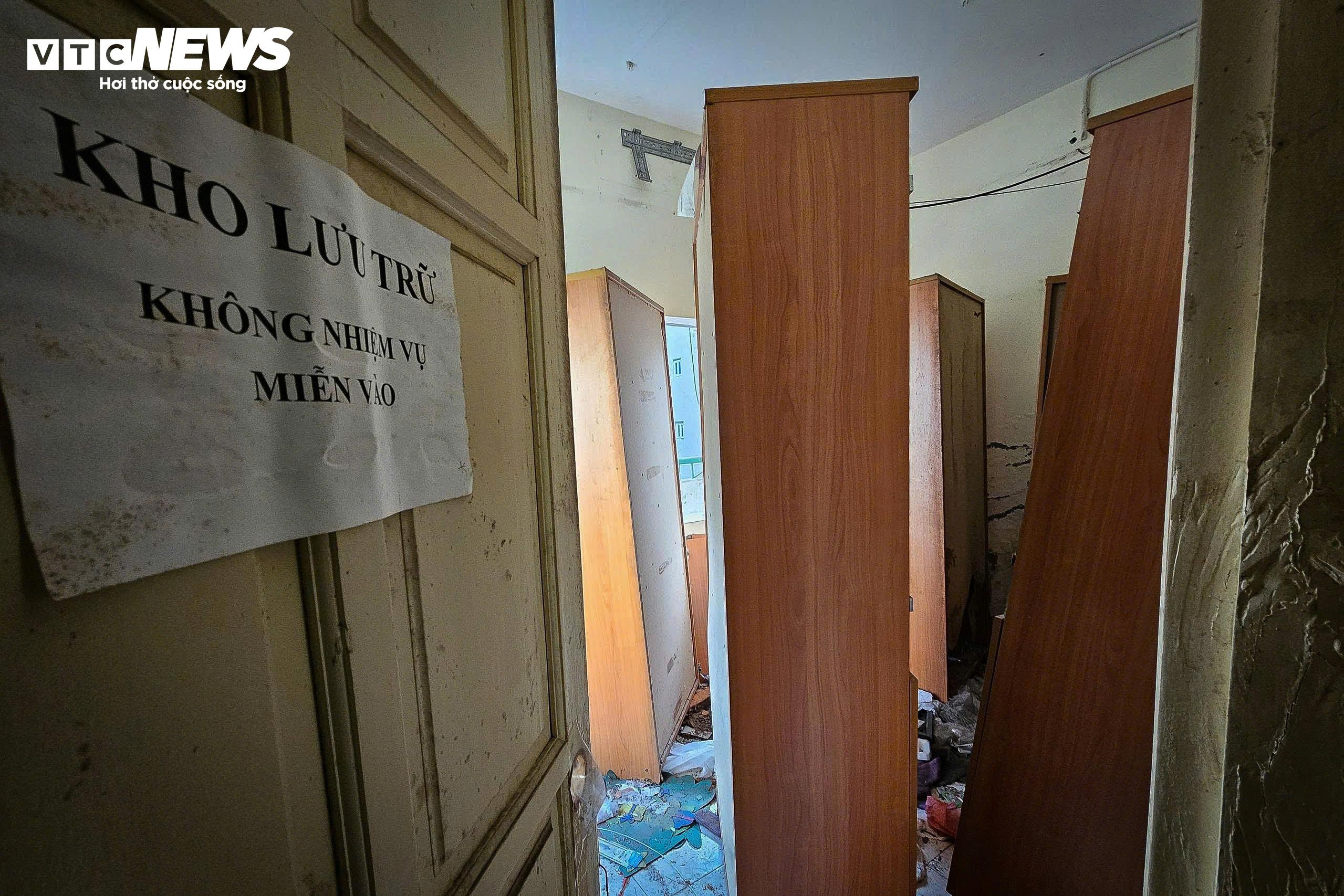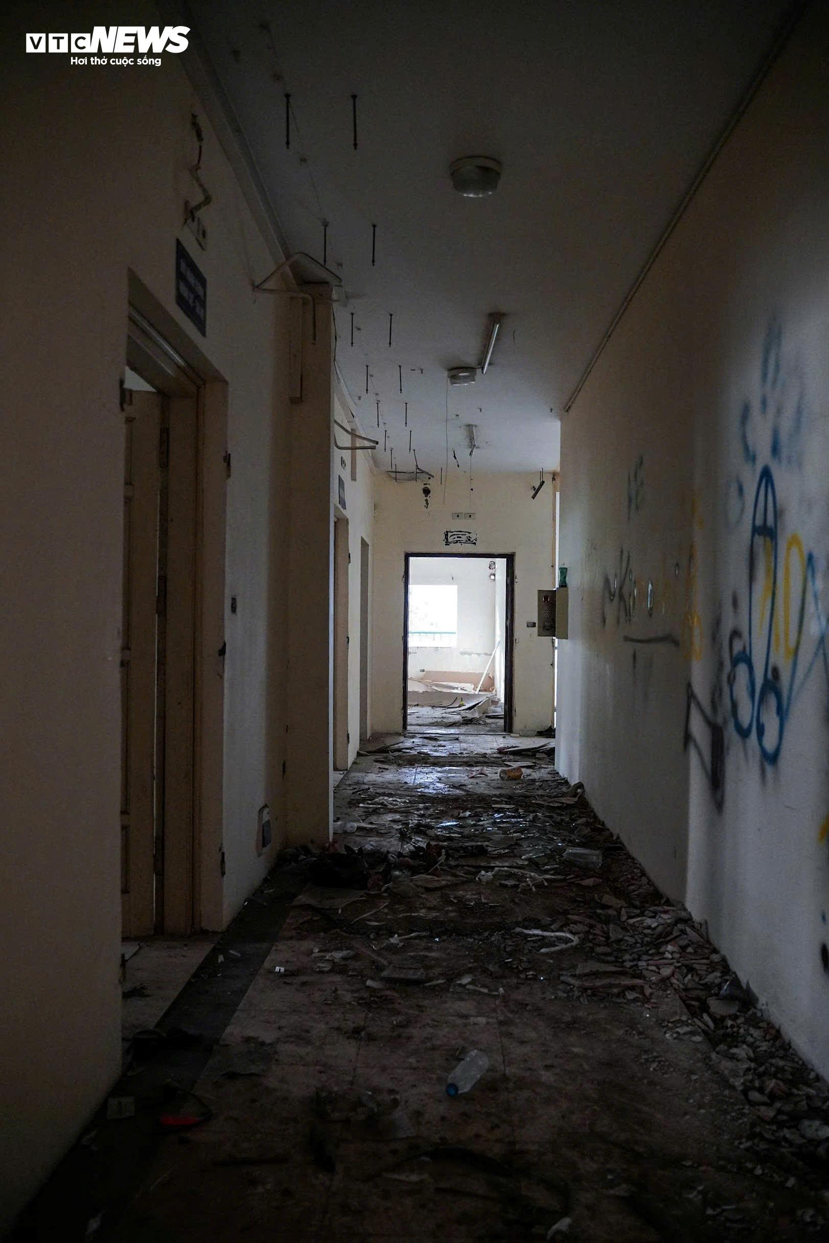 Hành lang tối tăm, đậm mùi ẩm mốc và bụi bặm sau thời gian dài không được sử dụng. Trên trần nhà, nhiều bóng đèn và thiết bị điện đã bị tháo dỡ, chỉ còn trơ lại các sợi dây và móc treo. Phía dưới sàn nhà phủ đầy gạch vỡ, thủy tinh, rác thải và những mảnh bê tông bong tróc. Mỗi bước chân qua đều phát ra tiếng lạo xạo của vật liệu vỡ vụn.