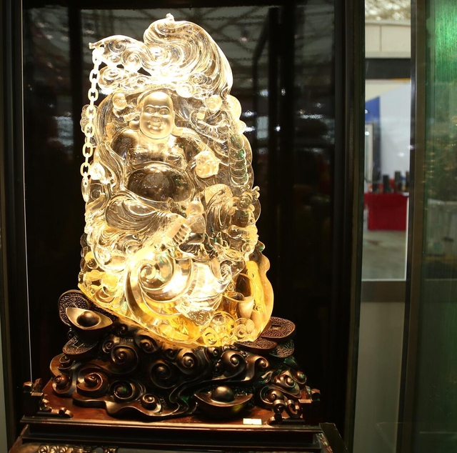 Một sản phẩm khác cũng làm từ thạch anh tóc vàng là Phật Bà Quan Âm cầm gậy như ý, có giá hơn 4 tỷ đồng. Ngoài ra, còn có rất nhiềunhững bức tượng Phật, linh vật, cột đá thạch anh, bàn ghế ngọc Hoàng Long… được chế tác công phu, tạo cảm giác vừa tráng lệ, vừa gần gũi.