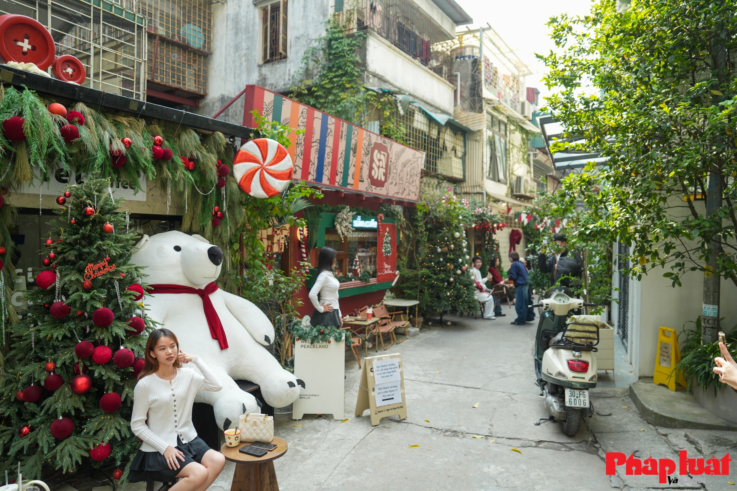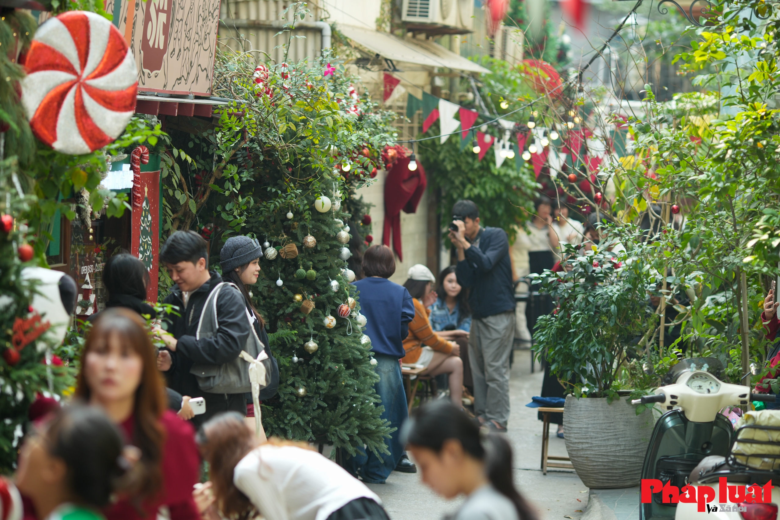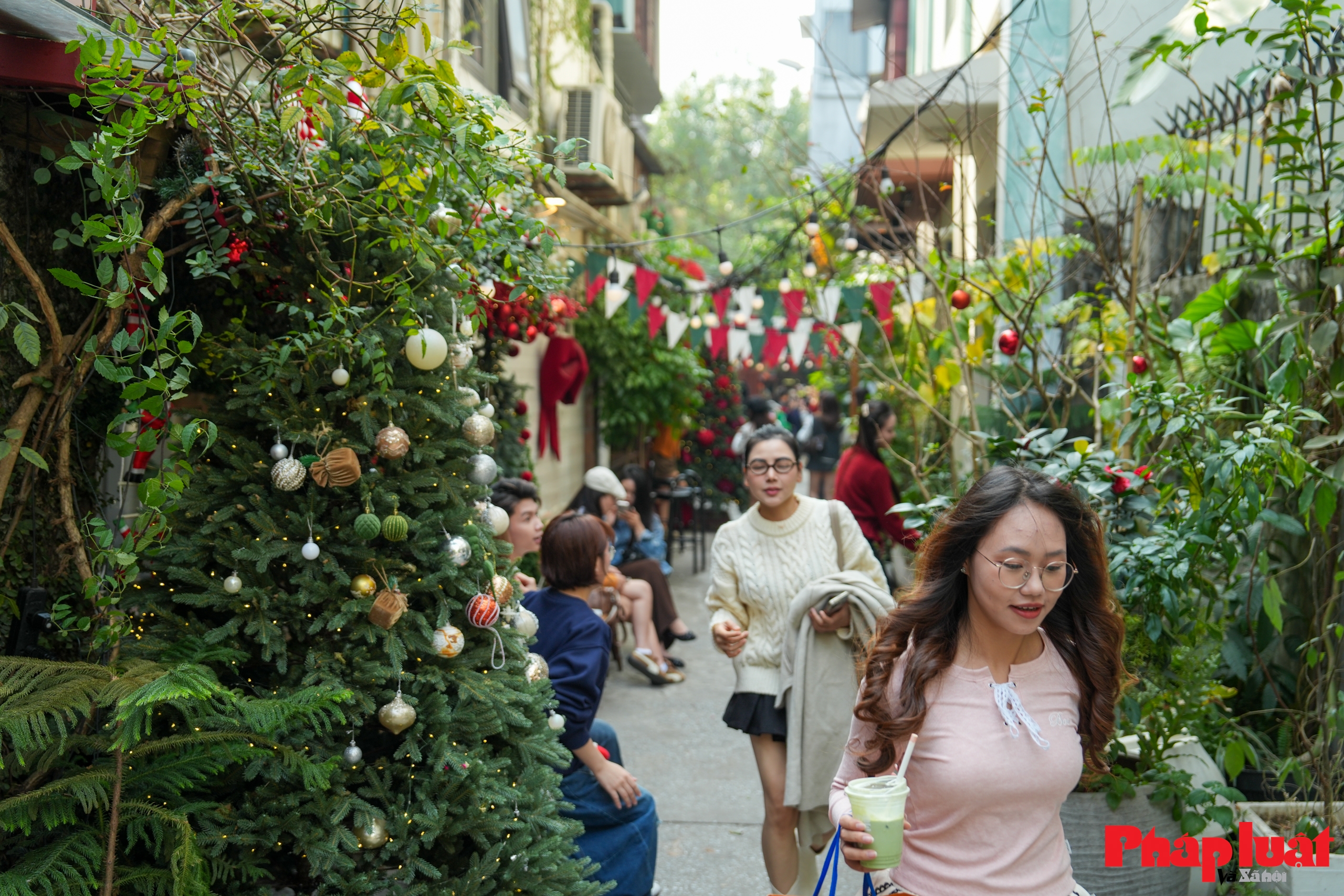 Con ngõ dài khoảng 100m tại khu D6 Trung Tự, nơi vốn tập trung nhiều quán cà phê, cửa hàng thời trang và đồ ăn đã được trang trí rực rỡ mùa Giáng sinh, trở thành điểm check-in thu hút đông đảo bạn trẻ.