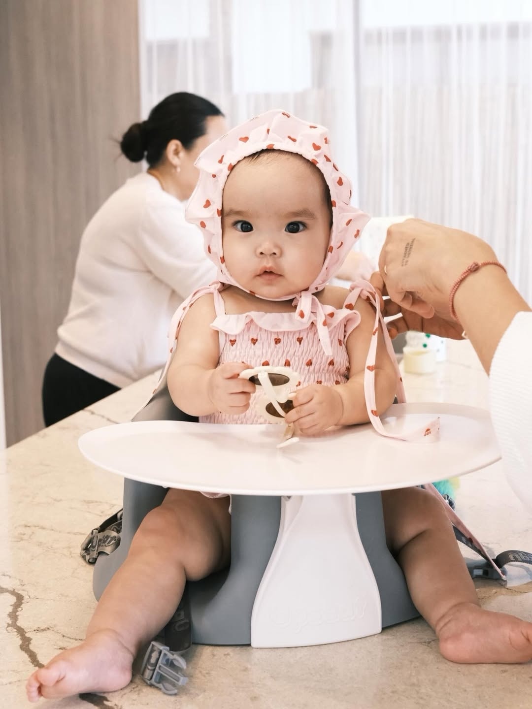 Hiện tại, ở tháng thứ 8, bé Gạo đã có thể ngồi vững và làm quen với phương pháp ăn dặm tự chỉ huy. Theo chia sẻ từ gia đình, cô nhóc rất ngoan ngoãn, thường xuyên quan sát xung quanh khi ngồi trên ghế và không quấy khóc. Có những lúc bé tự cầm bình sữa và ngủ ngon lành sau khi no bụng.