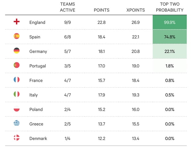 Bất chấp phong độ nghèo nàn, siêu máy tính của Opta khẳng định bóng đá Anh vẫn có tới 99,9% cơ hội cán đích trong top 2 bảng xếp hạng hệ số UEFA mùa này. Đây là vị trí đủ để giải đấu sở hữu 5 suất tham dự Champions League theo thể thức mới.
