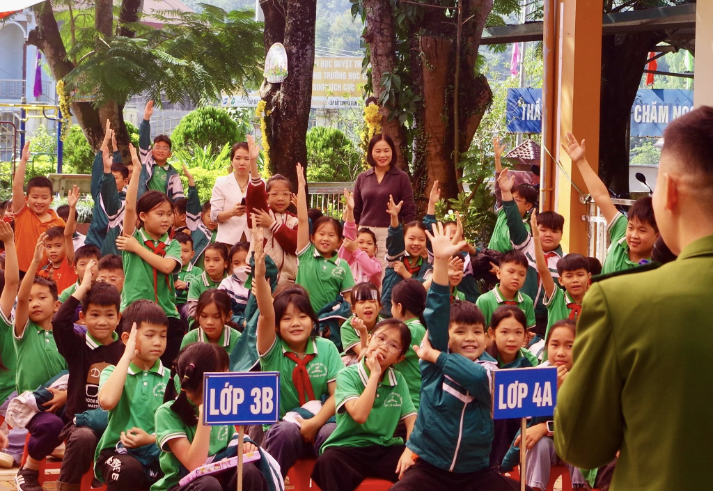 Học sinh Trường Tiểu học Duyệt Trung tham gia trả lời các câu hỏi tình huống, tìm hiểu pháp luật.