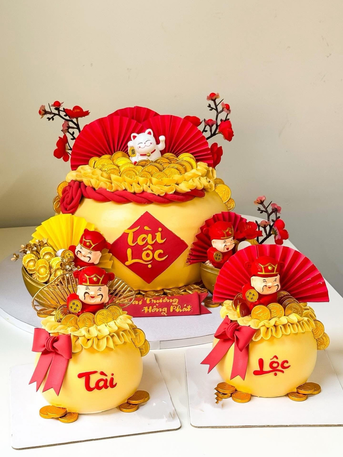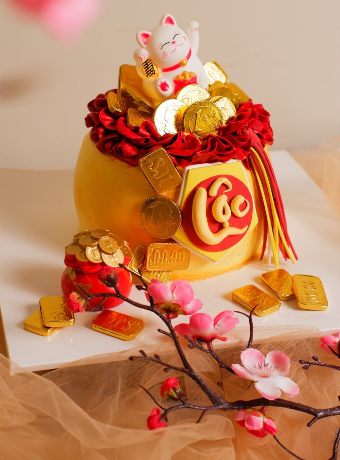 Các mẫu bánh kem năm nay được kỹ về phụ kiện như tượng Thần Tài, đồng tiền, thỏi vàng...Ảnh: Tiệm bánh Nani Koré