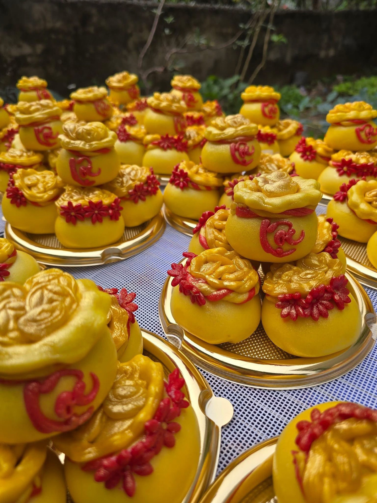 Những chiếc bánh bao túi tiền giá từ 75.000 - 100.000 đồng/set được thiết kế riêng cho ngày vía Thần Tài, thu hút đông đảo khách hàng đặt mua. Ảnh: FB Đinh Hương