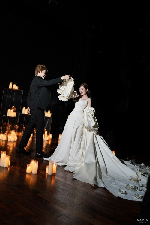 Trong lễ vu quy, Đình Tú còn chọn vest lịch lãm, Ngọc Huyền diện váy cúp ngực tôn vẻ gợi cảm. Ảnh: Saostar.