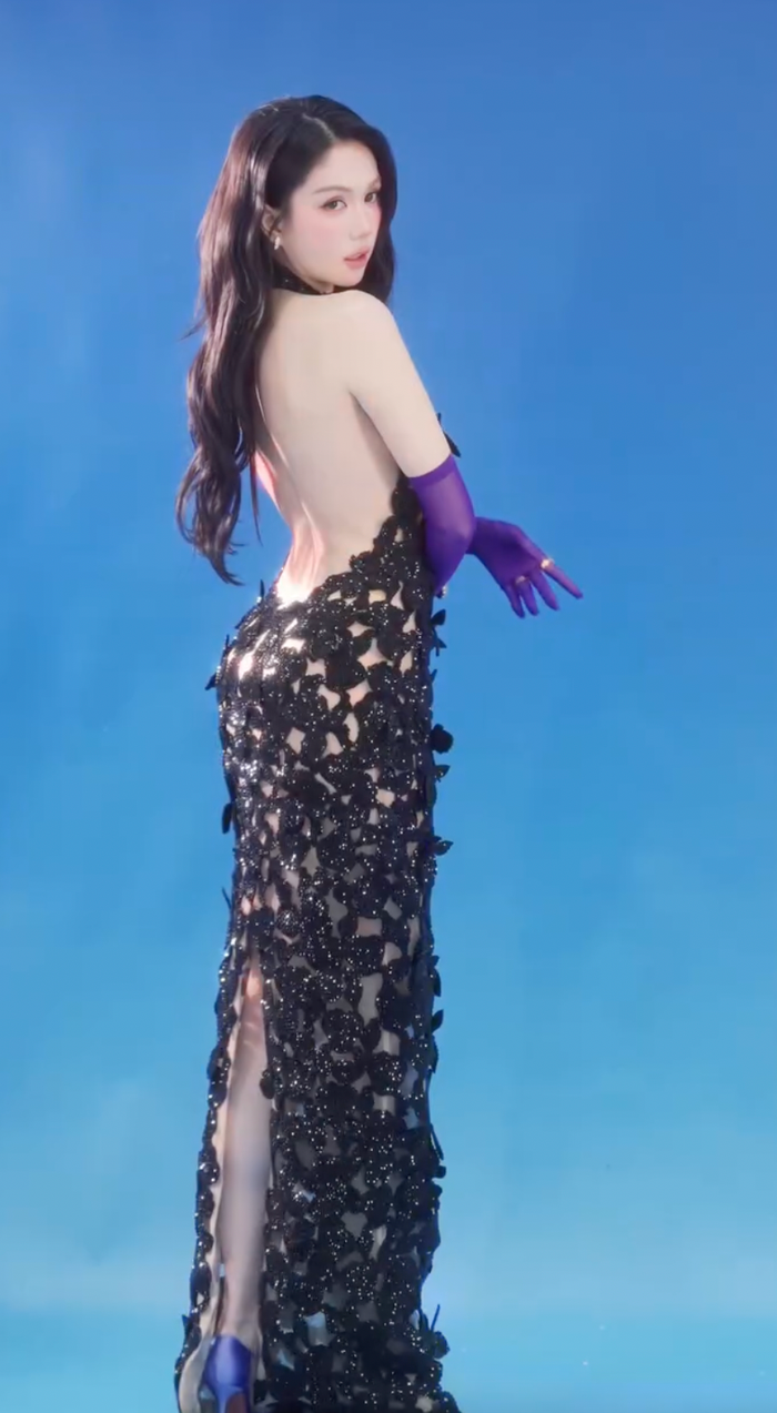 Trong một concept chụp ảnh nền xanh tối giản, người đẹp lựa chọn mẫu váy đen xuyên thấu, ôm sát cơ thể, tôn lên đường cong mềm mại. Điểm nhấn đặc biệt nằm ở phần lưng trần được cắt xẻ sâu, để lộ làn da trắng mịn vốn đã trở thành “thương hiệu” của cô. Thiết kế đính kết lấp lánh giúp tổng thể thêm phần sang trọng, kết hợp cùng găng tay tím tạo nên sự phá cách nhưng vẫn hài hòa.