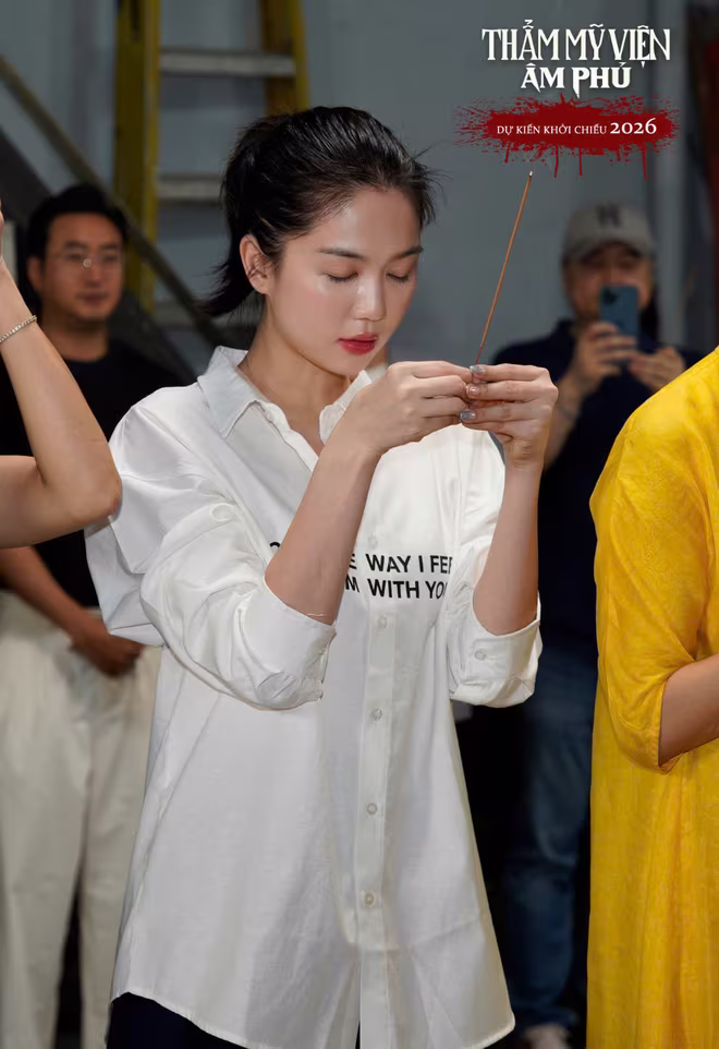 Những hình ảnh Ngọc Trinh trong buổi cúng khai máy dự án mới đây được nhà sản xuất hé lộ. “Nữ hoàng nội y” xuất hiện giản dị với áo sơ mi trắng phối chân váy đen, trang điểm nhẹ và cột tóc đơn giản. Cô chu đáo chuẩn bị quà tặng cho từng thành viên trong đoàn, mong cả ê-kíp cùng nhau bước vào hành trình làm phim thuận lợi.