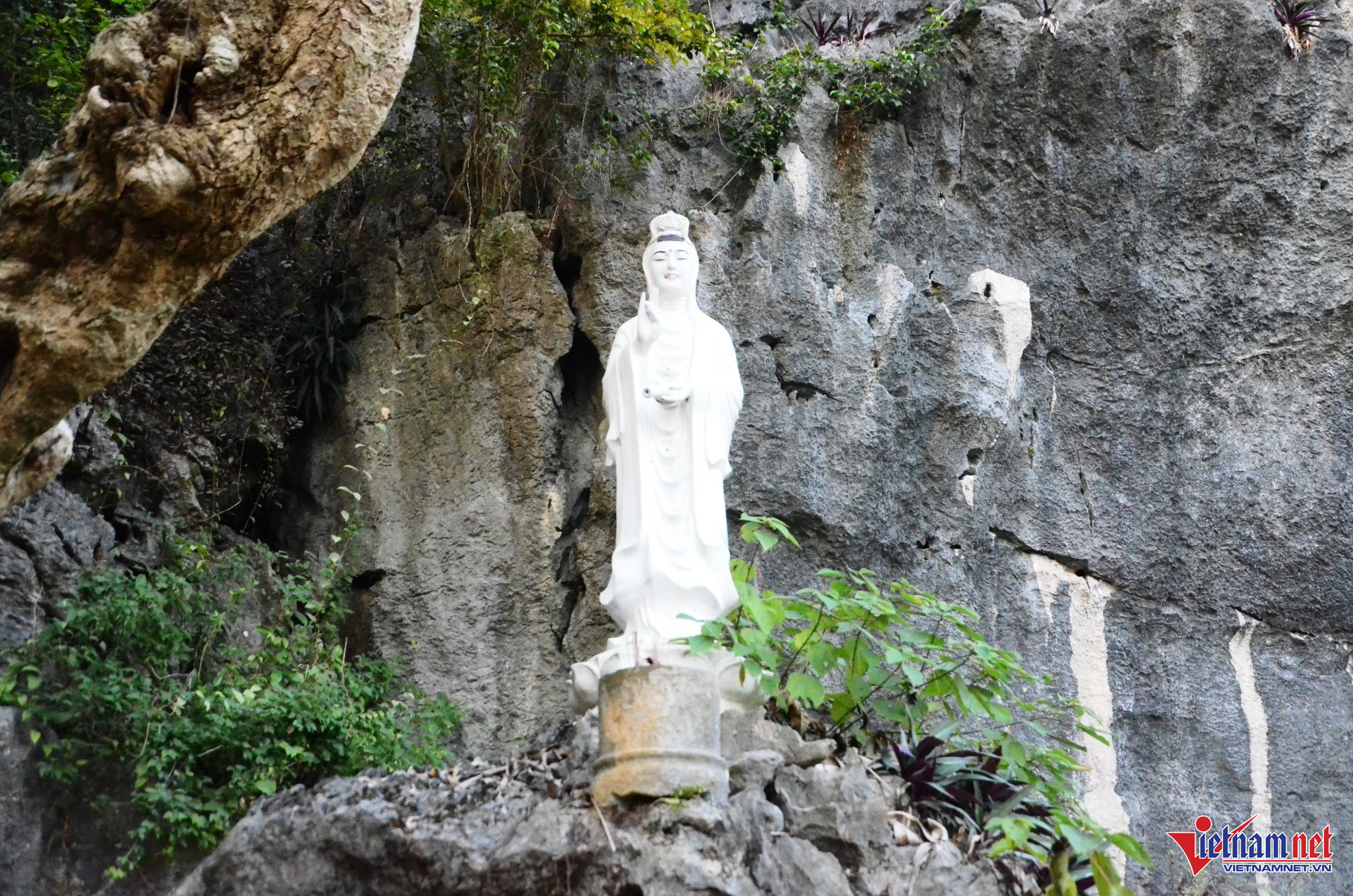 Trên vách đá ở núi Đại Tượng thờ bức tượng Quan Thế Âm bằng đá.