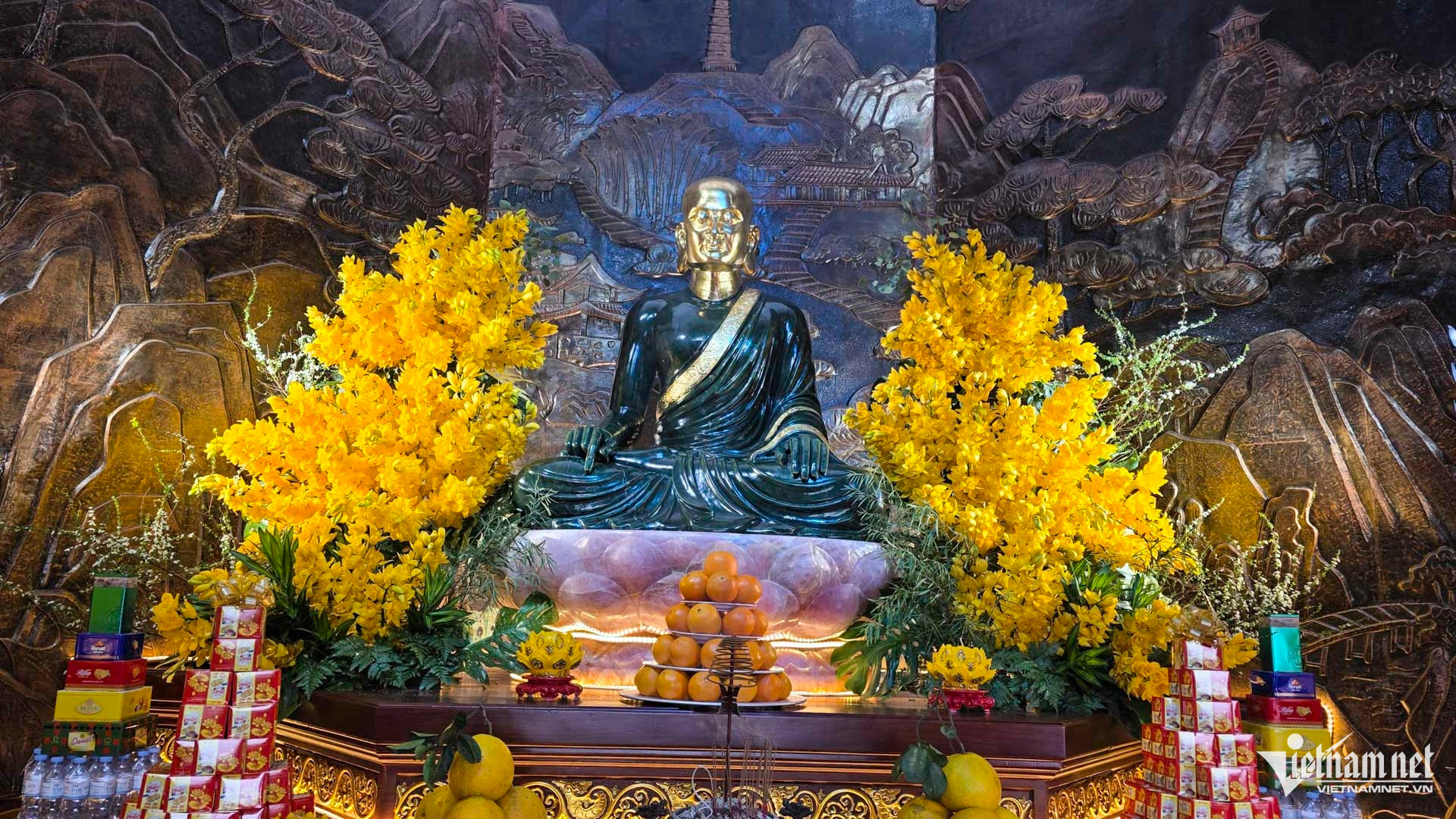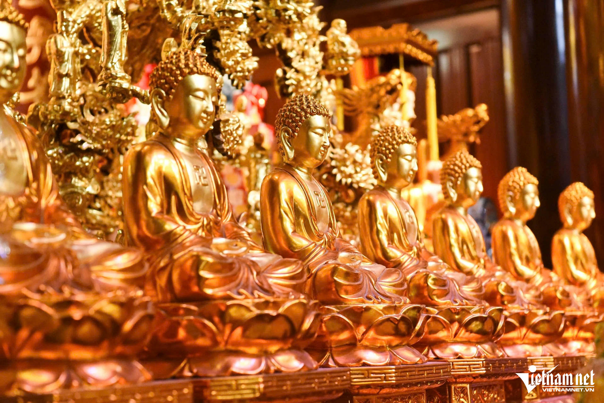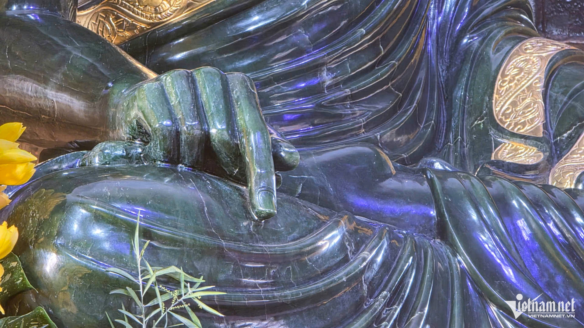 "Pho tượng được chế tác từ ngọc nguyên khối nặng hơn 8 tấn, có độ thuần khiết cao, được khai thác tại Cassiar (Canada). Trước khi được an vị tại đây, pho tượng đã được cung rước qua các ngôi chùa lớn như chùa Bái Đính, chùa Yên Tử, chùa Vĩnh Nghiêm và chùa Phật Tích", thượng tọa Thích Thanh Anh cho hay.