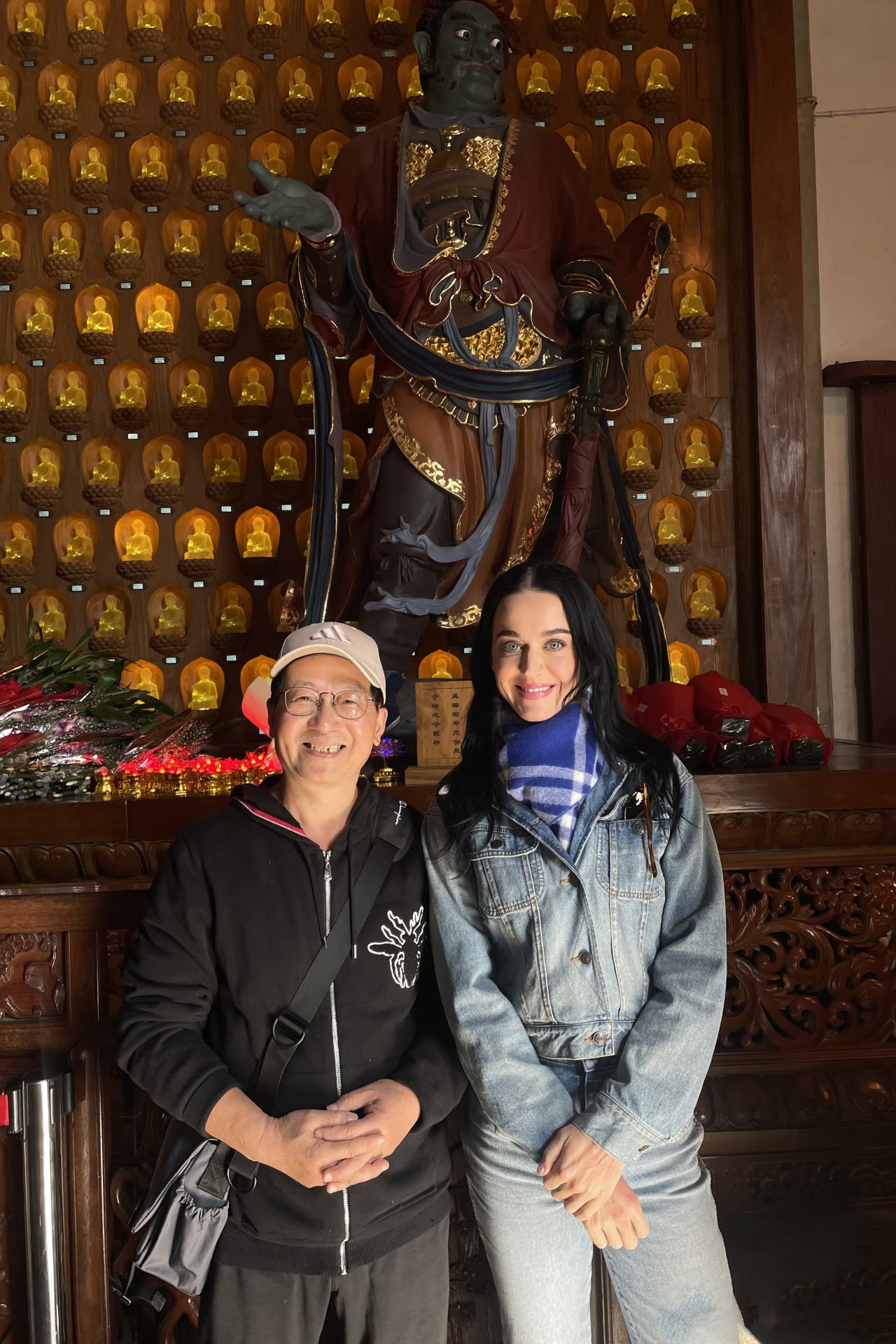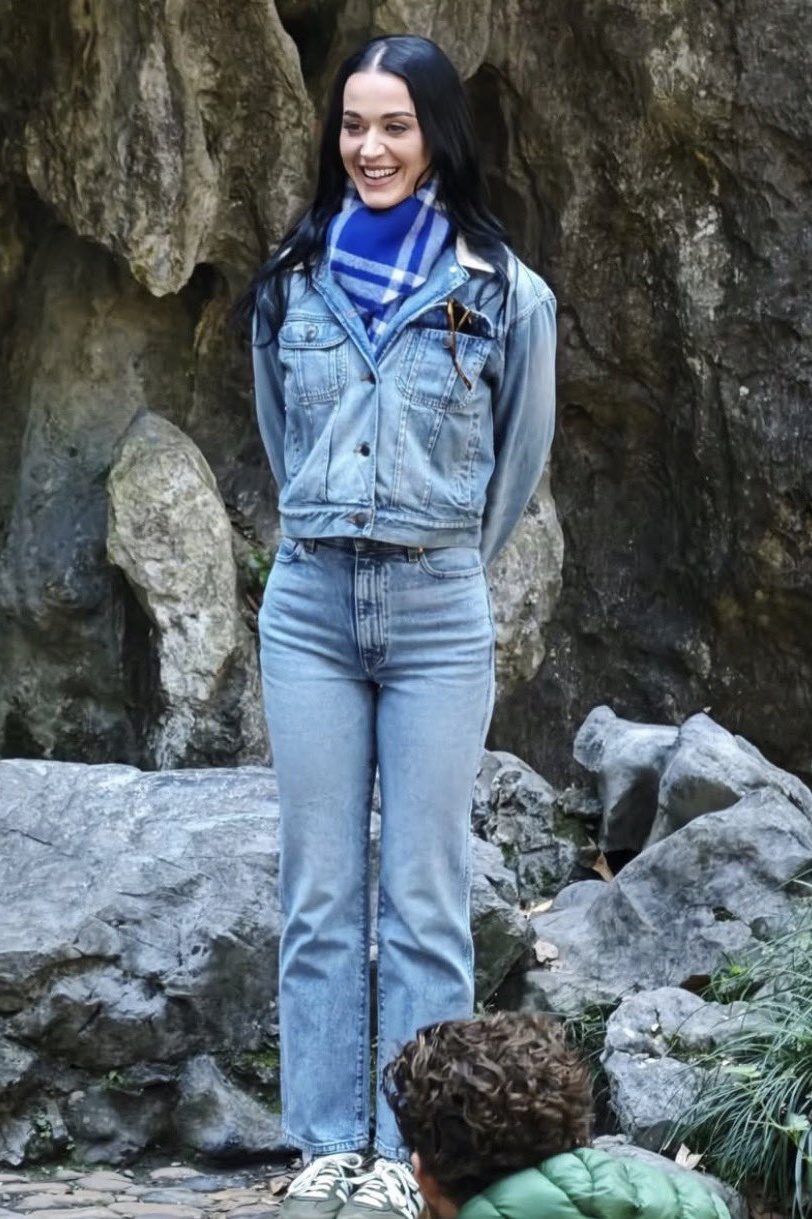 Ngày 23/11, nhiều tài khoản X gây chú ý khi đăng hình ảnh Katy Perry đến thăm chùa Linh Ẩn (Hàng Châu, Trung Quốc). Nữ ca sĩ xuất hiện giản dị với trang phục jeans, quấn khăn choàng cổ. Cô trang điểm nhẹ, để kiểu tóc buông xõa tự nhiên. Ảnh: X/liu_shuo55555.
