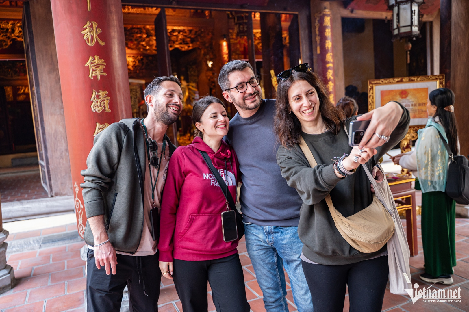 Chị Carotta (ngoài cùng bên phải) và bạn bè rất ấn tượng với kiến trúc của ngôi đền. Ảnh: Nguyễn Huy