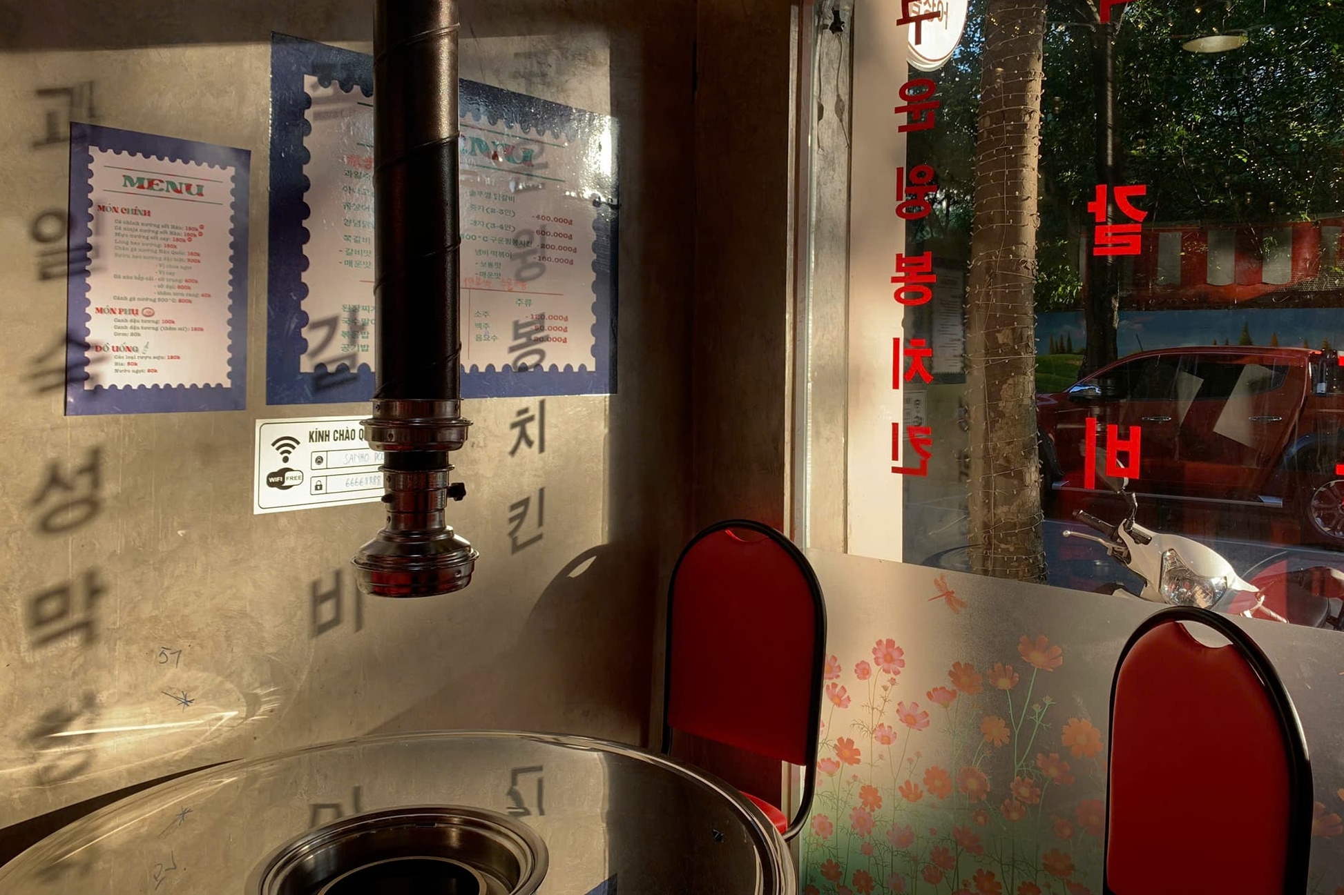 Theo đó, quán nướng tên Sanho Pocha tái hiện khá trọn vẹn không khí của các pocha ở Seoul với menu dán thẳng lên tường, những ô lều dựng từ bạt nhựa màu cam, bàn nhôm đen vàng và ánh đèn vàng ấm.