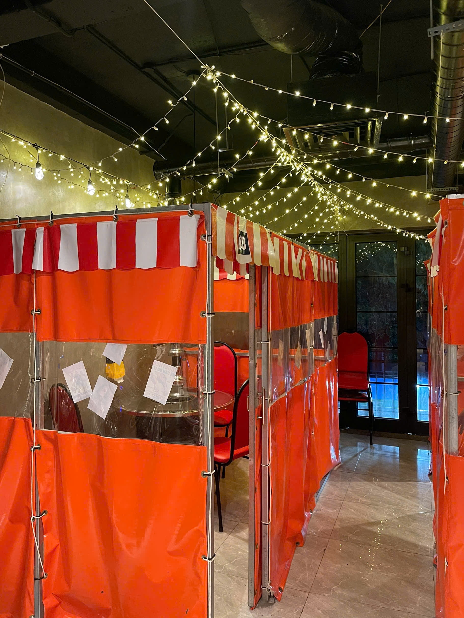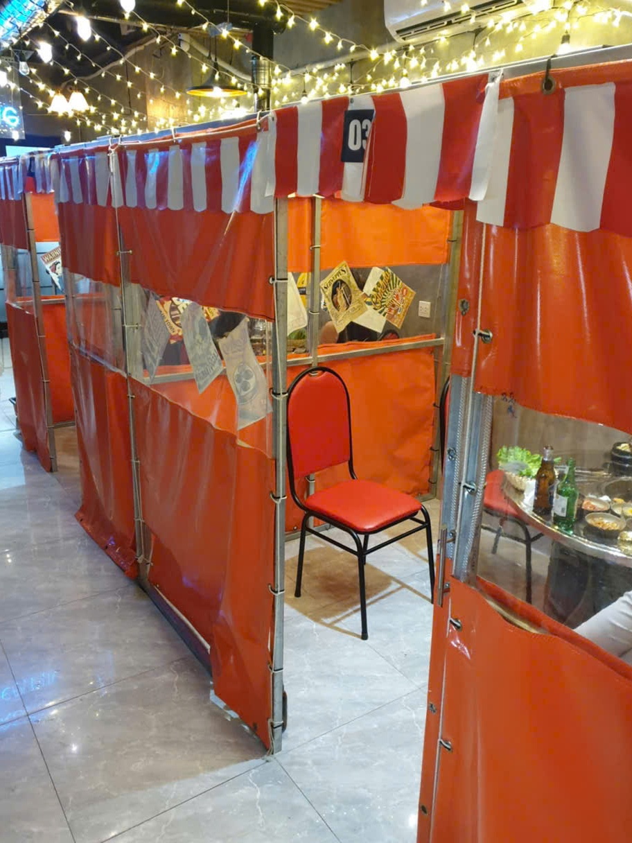 Bạt cam căng thành từng ô lều trong quán Pocha ở Hà Nội. Ảnh: Trung Hiếu.