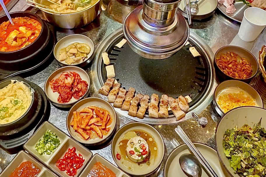 Pan chan, tức các món ăn kèm, được đưa ra khá nhanh và đầy đặn, mỗi bàn còn có thêm một phần trứng hấp nóng hổi. Menu phong phú với các món nướng, món cay, hải sản, tteokbokki, chả cá.