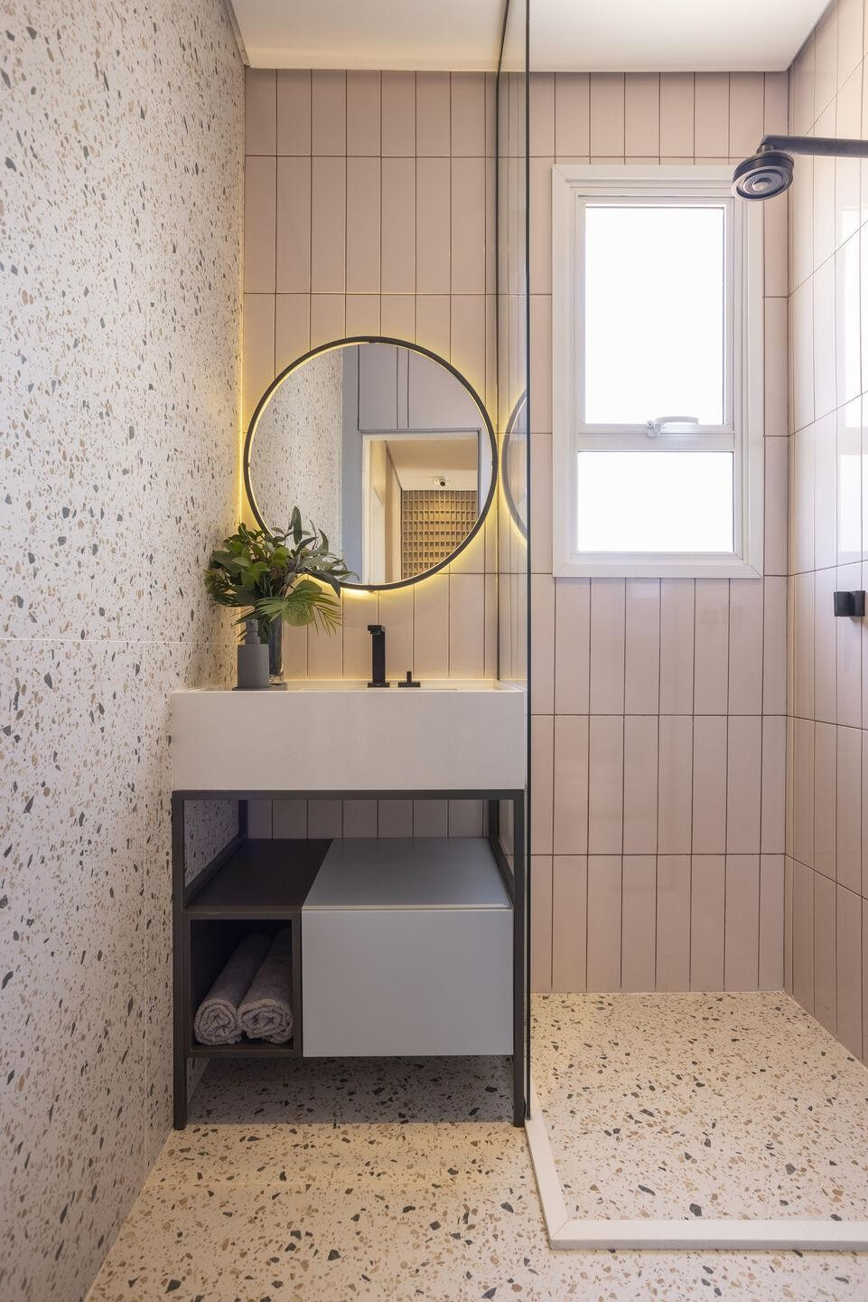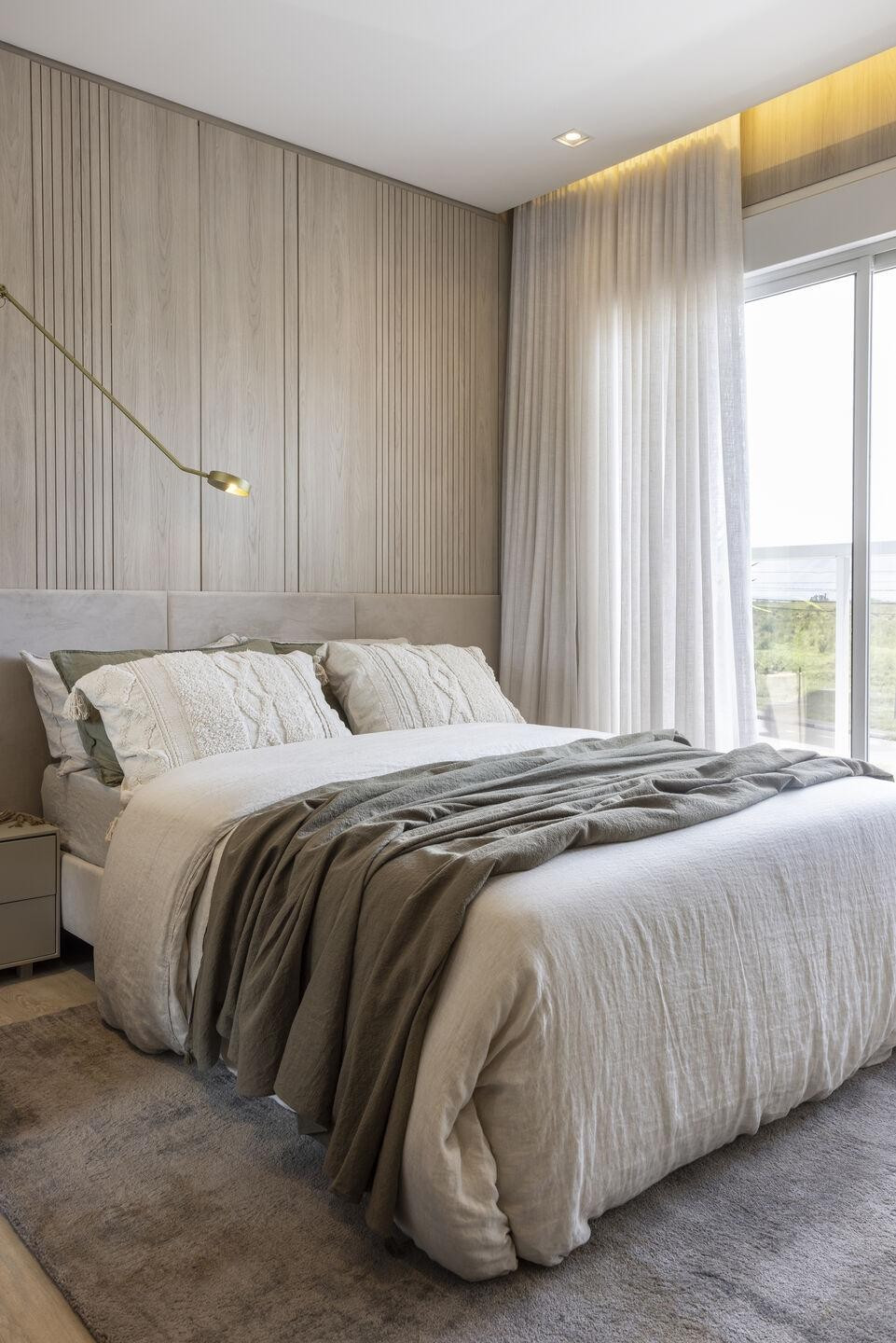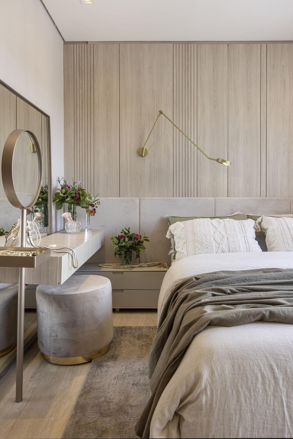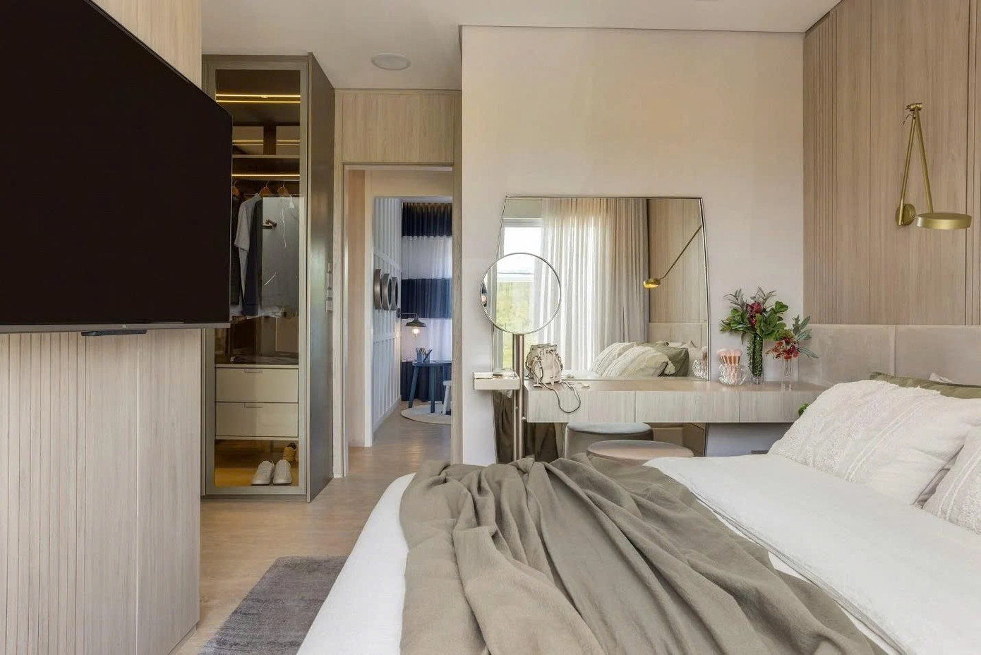Phòng ngủ bố mẹ quay về với tinh thần mộc mạc và tự nhiên, sử dụng rèm vải lanh, vải nỉ, gỗ sáng và gam be chủ đạo. Mảng tường đầu giường ốp gỗ mang lại cảm giác ấm áp, bao bọc. Phòng thay đồ được bố trí khoa học với hệ tủ kính khung nhôm, tối ưu công năng sử dụng. Phòng tắm riêng ốp đá marble vân vàng nhạt, kết hợp chất liệu kim loại đồng ở vòi rửa và vòi sen, tạo nên vẻ sang trọng tinh tế, trong khi phòng tắm chung trẻ trung với gạch terrazzo, gạch ốp dọc và gương tròn LED âm, mang hơi thở đương đại rõ nét.